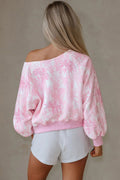 Pink Abstract Woodland Print Asymmetric Shoulder Long Sleeve Top