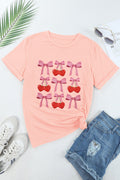 Pink Bow Cherry Print Crew Neck Casual T Shirt
