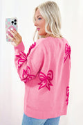 Pink Bow Pattern Drop Shoulder Loose Sweater