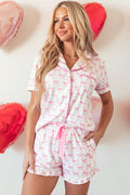 Pink Bowknot Printed Short Sleeve and Ruffled Shorts Pajama Set
