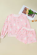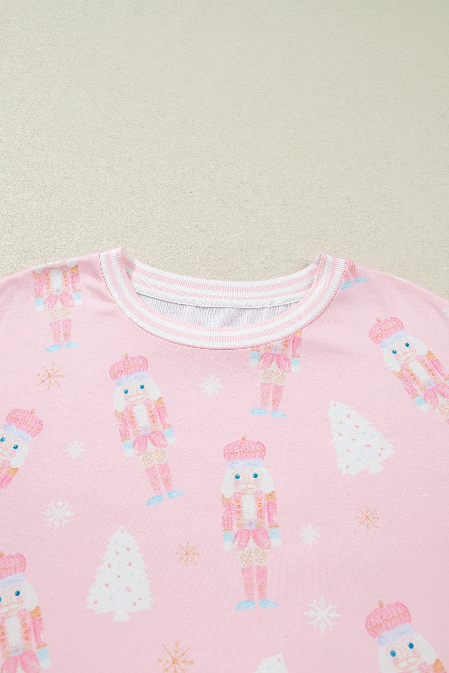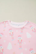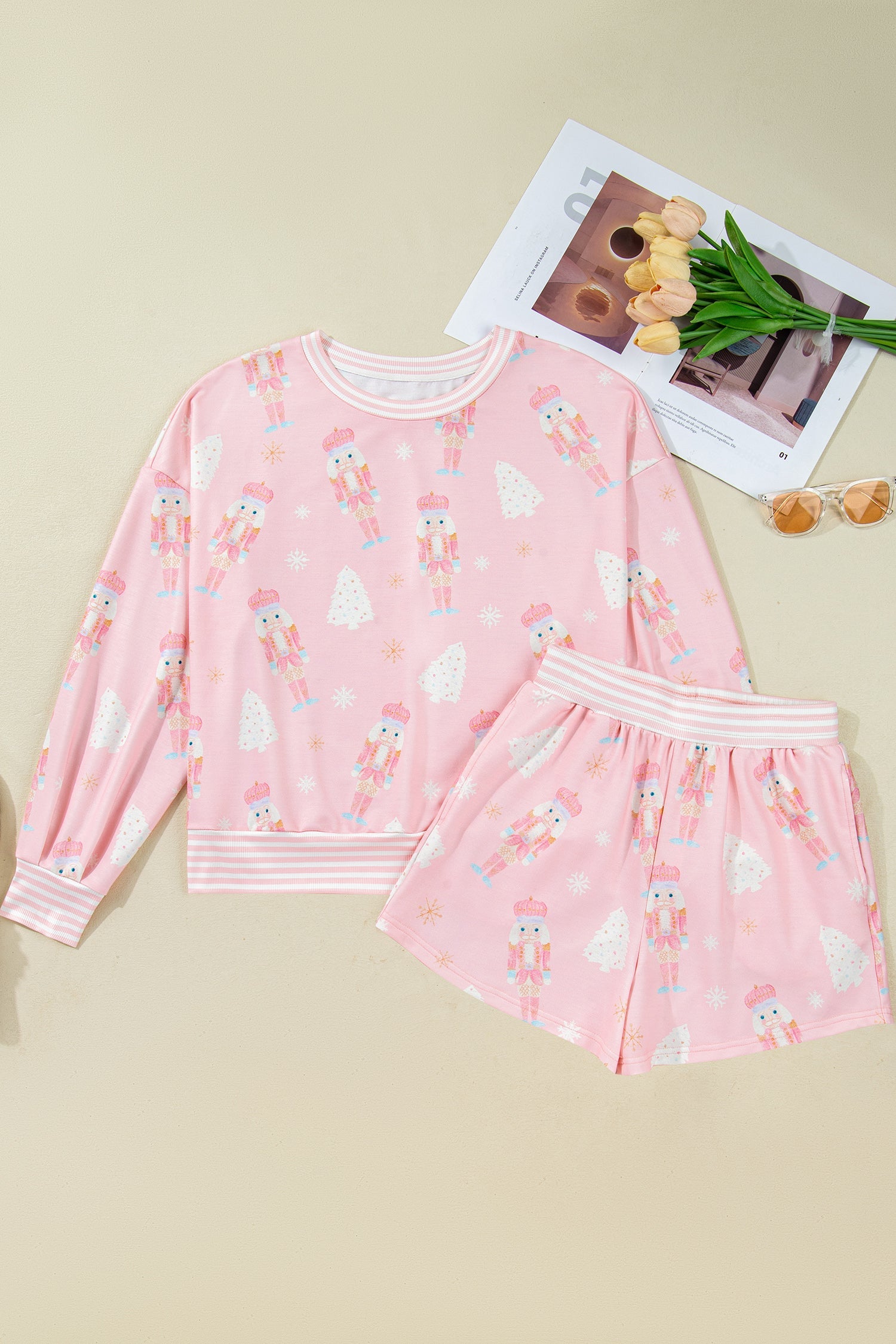 Pink Christmas Tree Nutcracker Doll Print Contrast Trim Long Sleeve Top Matching Shorts Set