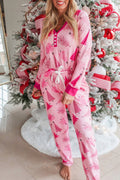 Sale Pink Christmas Tree Print V Neck Buttoned Pullover and Drawstring Pants Lounge Set