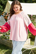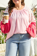 Pink Contrast Floral Patchwork Long Sleeve Plus Size Blouse