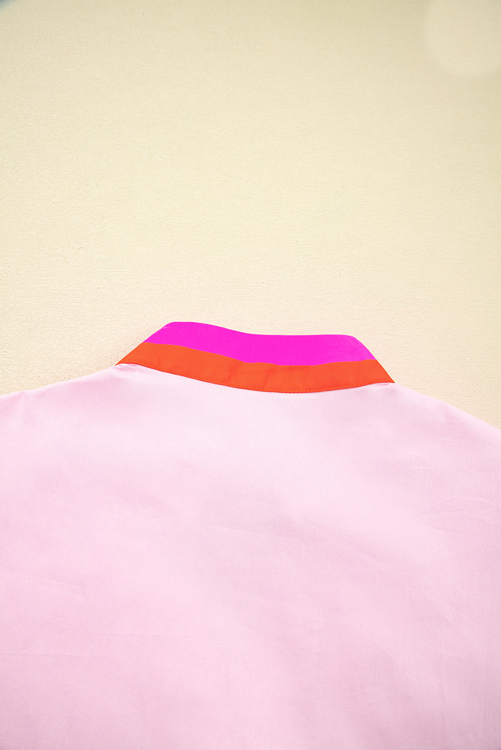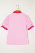 Sale Pink Contrast Striped V Neck Collision Short Puff Sleeve Blouse
