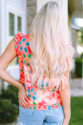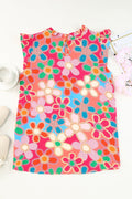 Pink Embroidered Detail Floral Print Ruffle Trim Tank Top
