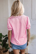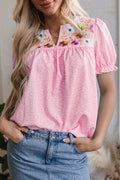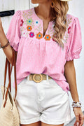 Sale Pink Floral Embroidered Puff Sleeve Notched V Neck Blouse