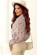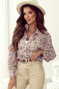 Sale Pink Floral Print Bishop Sleeve Collared V Neck Shirt