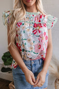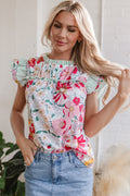 Pink Floral Print Contrast Ruffle Trim Short Sleeve Blouse