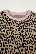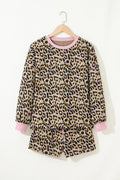 Pink Leopard Print Contrast Edge Long Sleeve Pullover Shorts Set