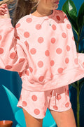 - Cute polka dot set offering a relaxed, stylish look for everyday comfort.Drop shoulder pullover top adds a trendy, effortless vibe to your outfit.Soft drawstring shorts give a customizable comfort for lounging or casual wear.A versatile polka dot lounge set that pairs easily with sneakers or slides.