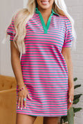 Sale Pink Stripe Collared V Neck Puff Sleeve T Shirt Dress