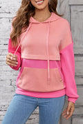 Sale Pink Textured Color Block Kangaroo Pocket Drop Shoulder Hoodie