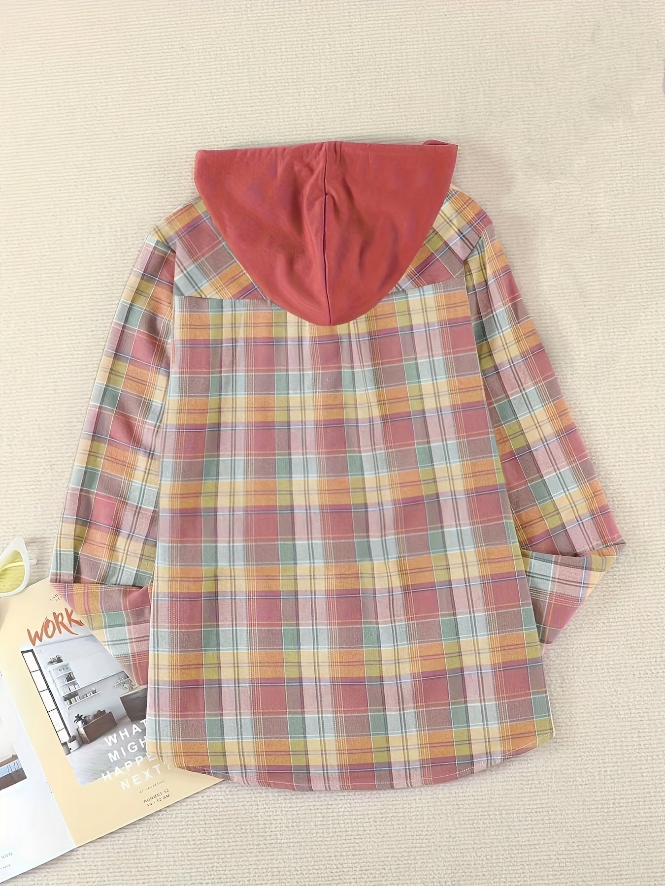 Plaid Print Hooded Shirt, Casual Long Sleeve Drawstring Shirt