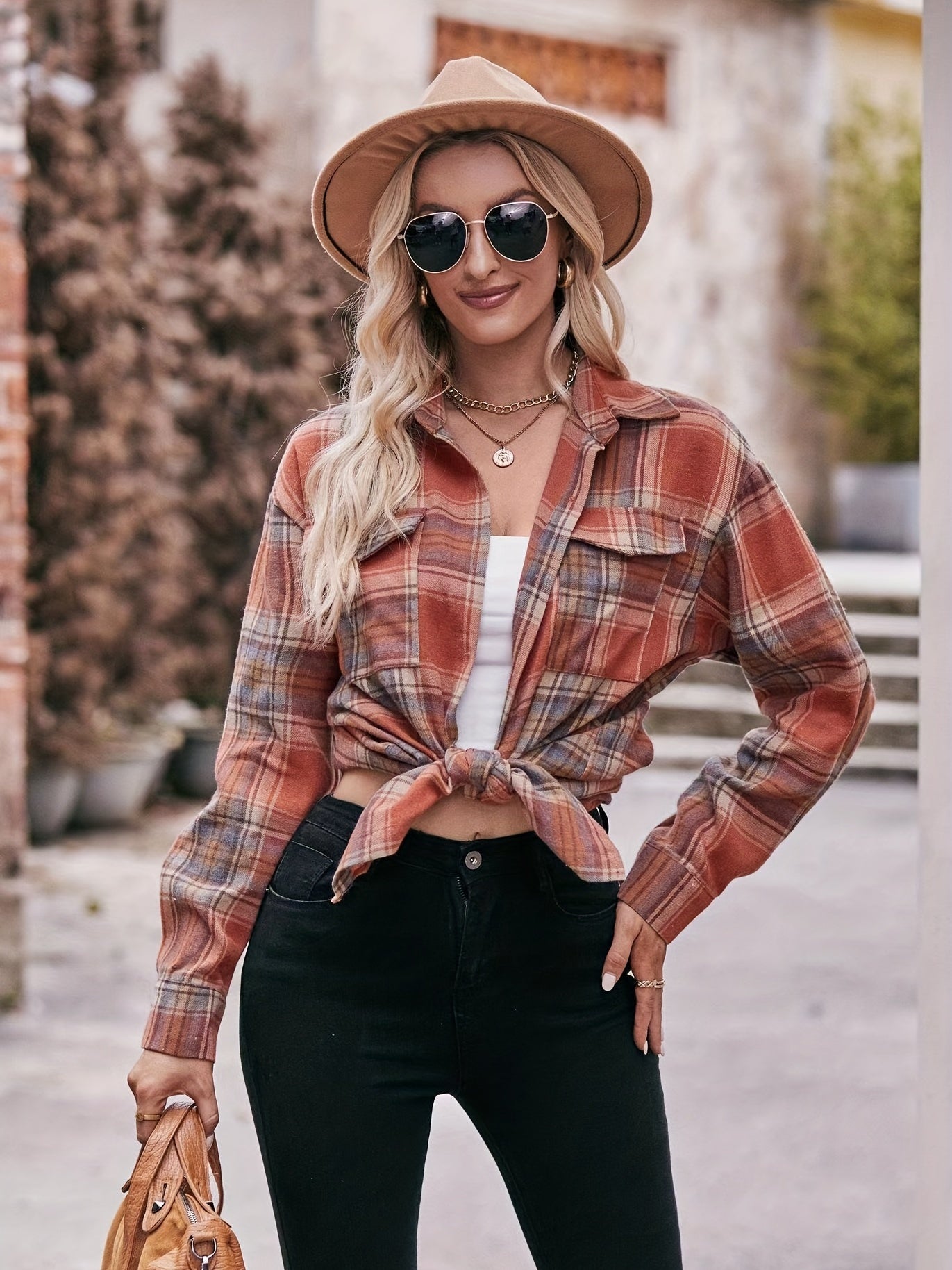 Sale Plaid Print Polo Collar Button Shirt, Casual Long Sleeve Shirt