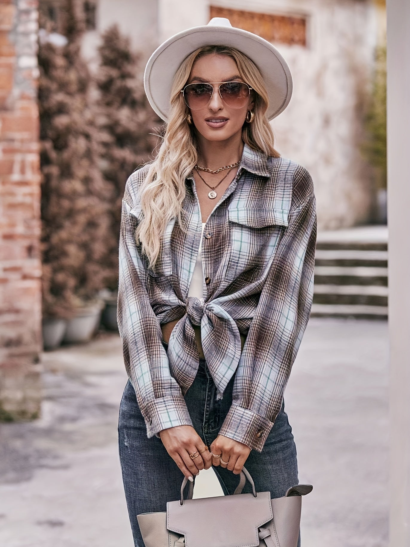 Plaid Print Polo Collar Button Shirt, Casual Long Sleeve Shirt