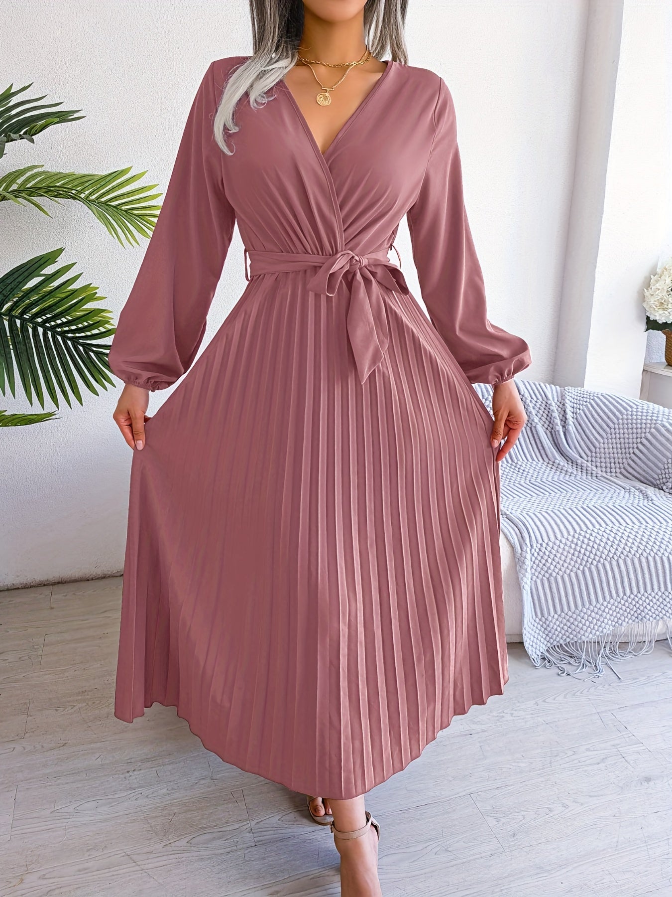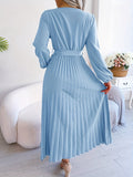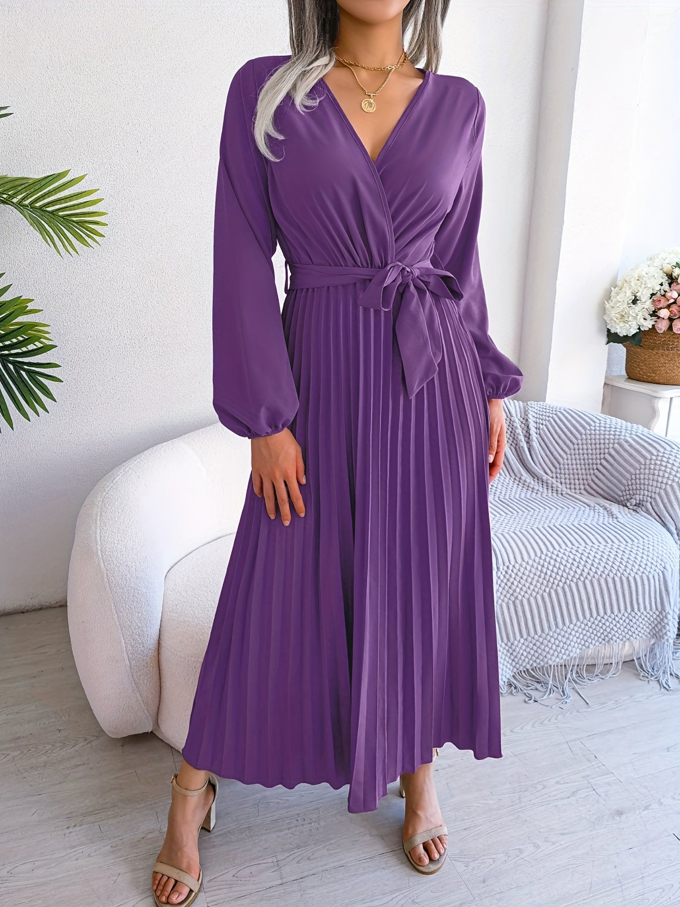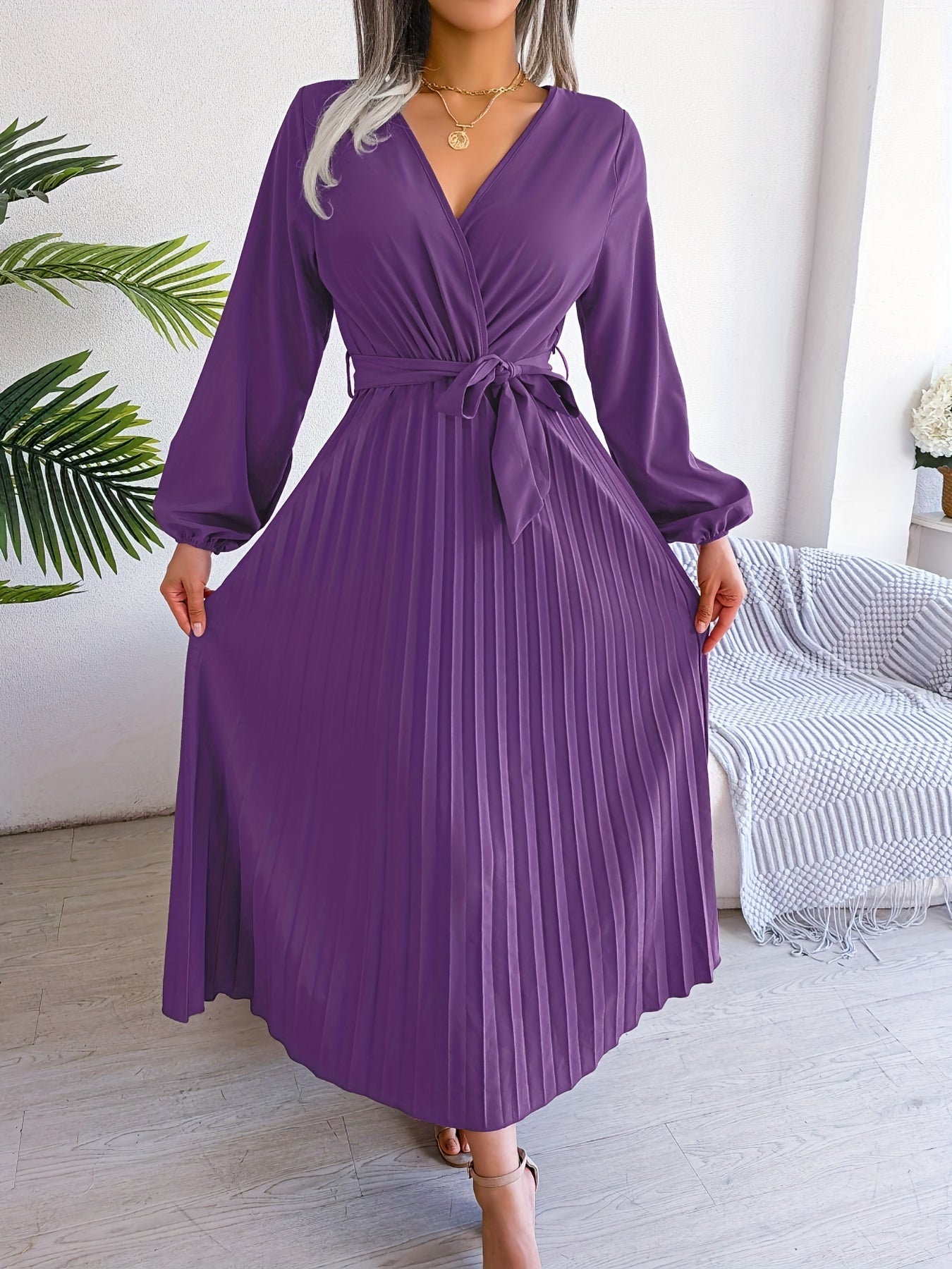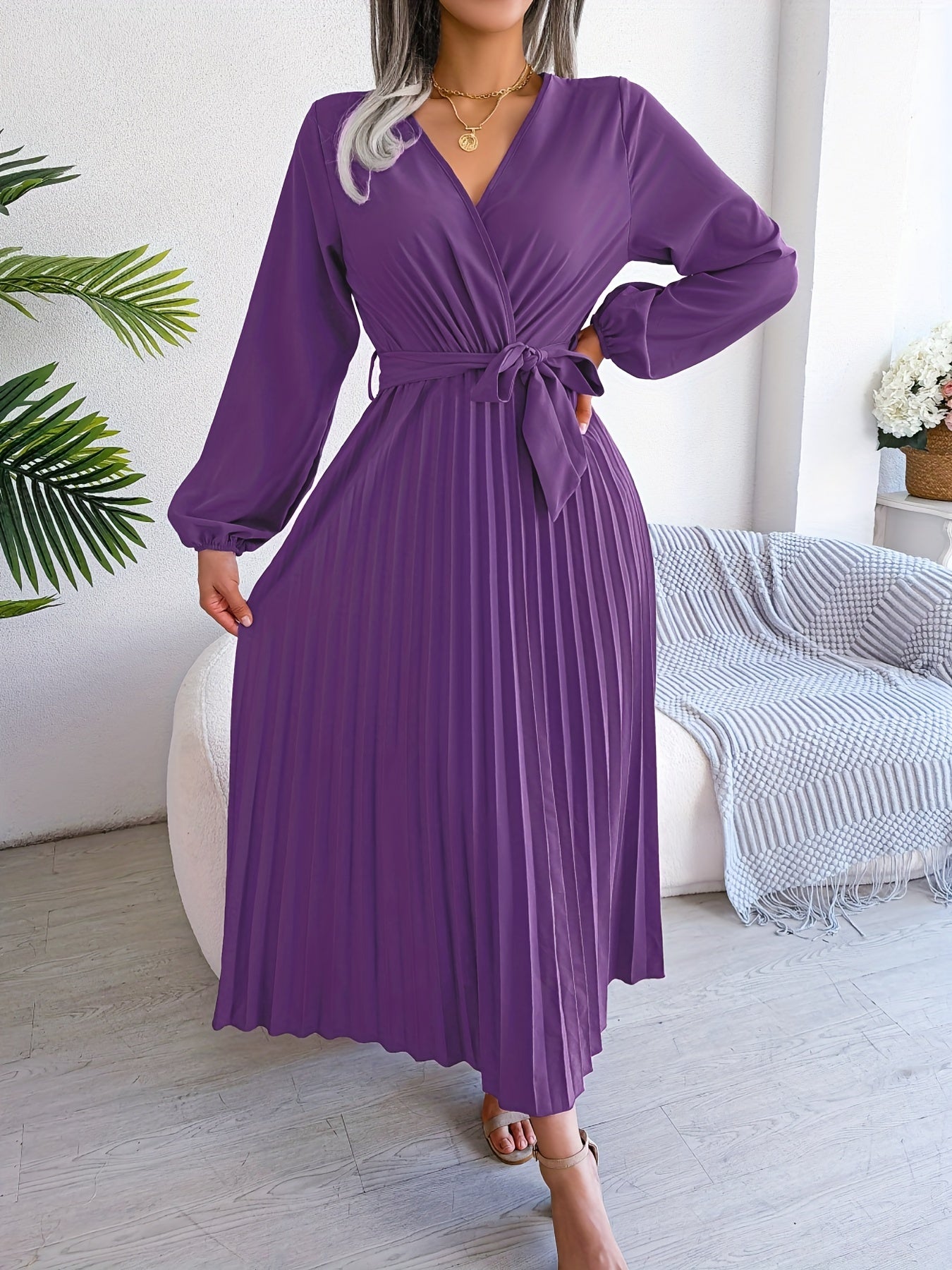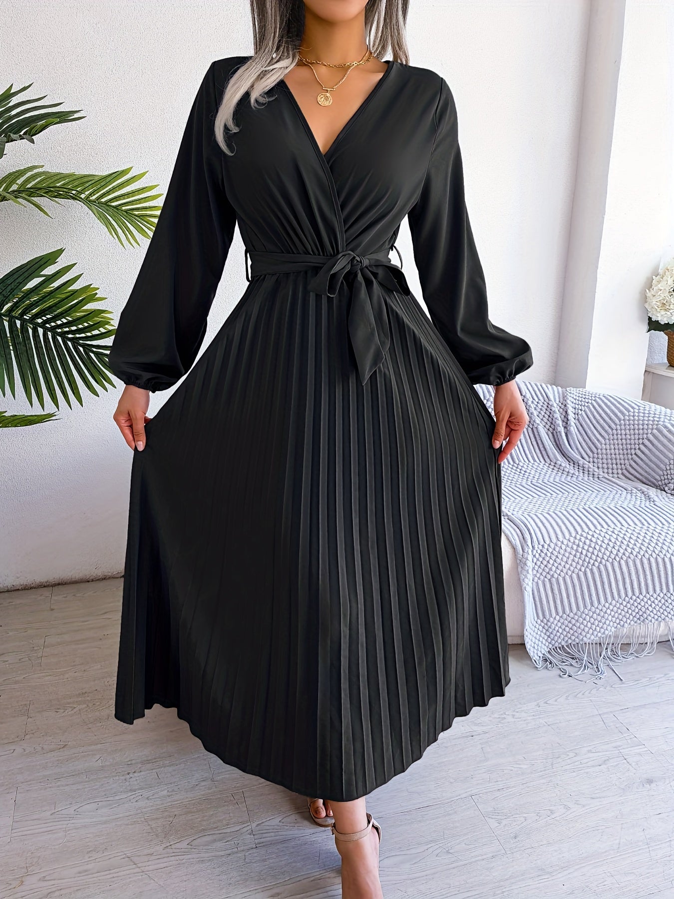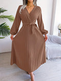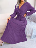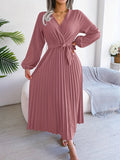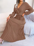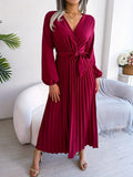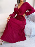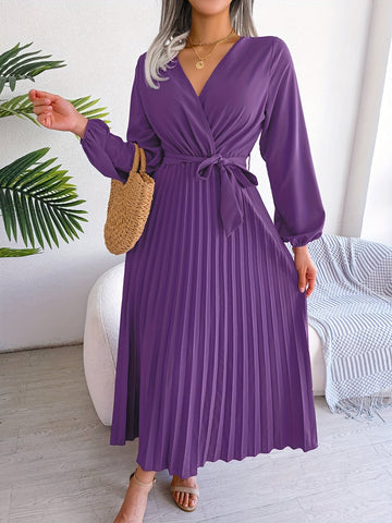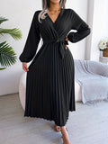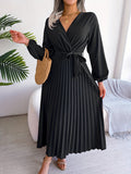 Pleated Surplice Neck Dress, Elegant Long Sleeve Solid Dress, Women's Clothing