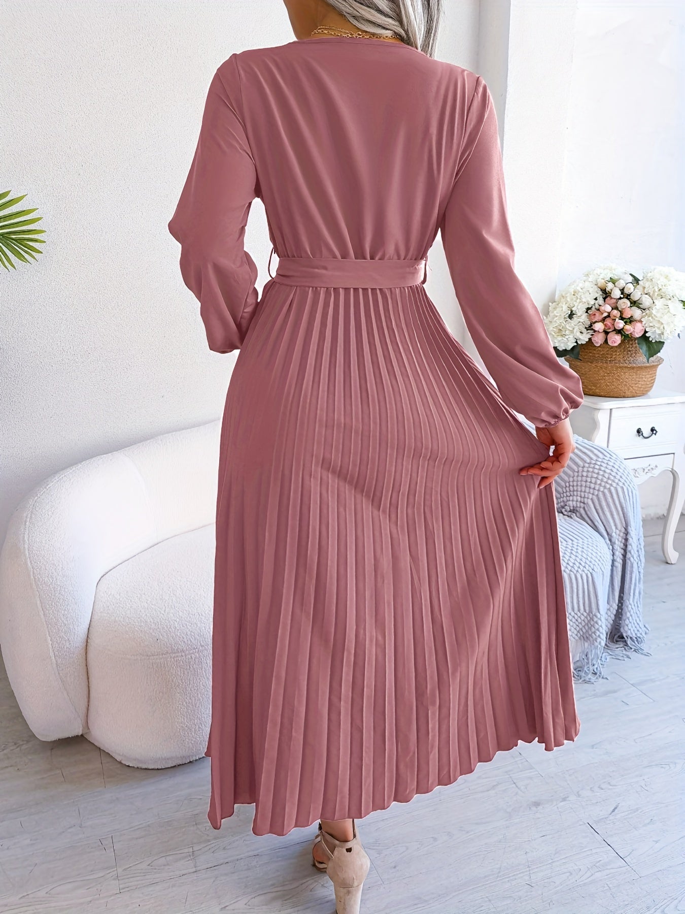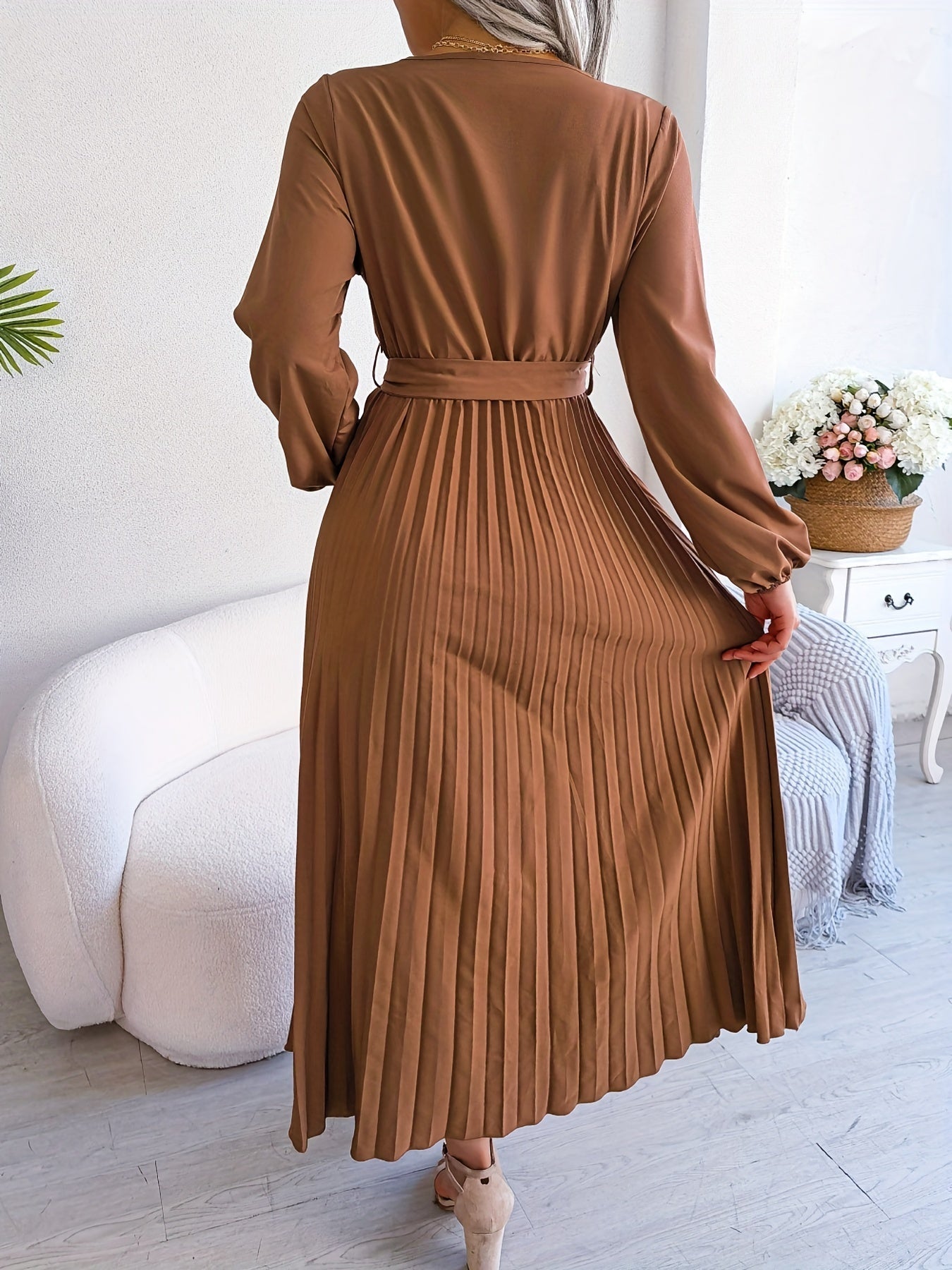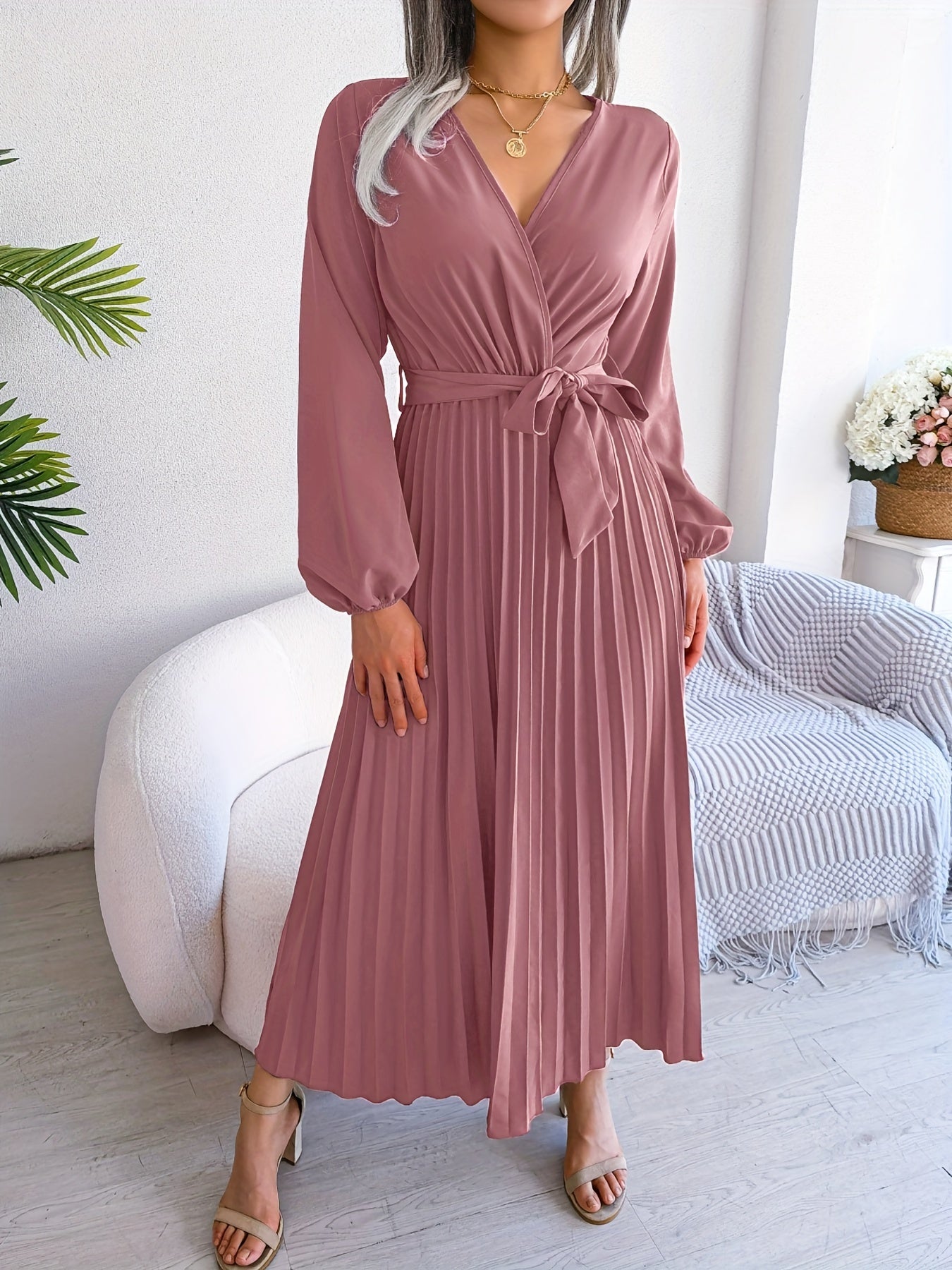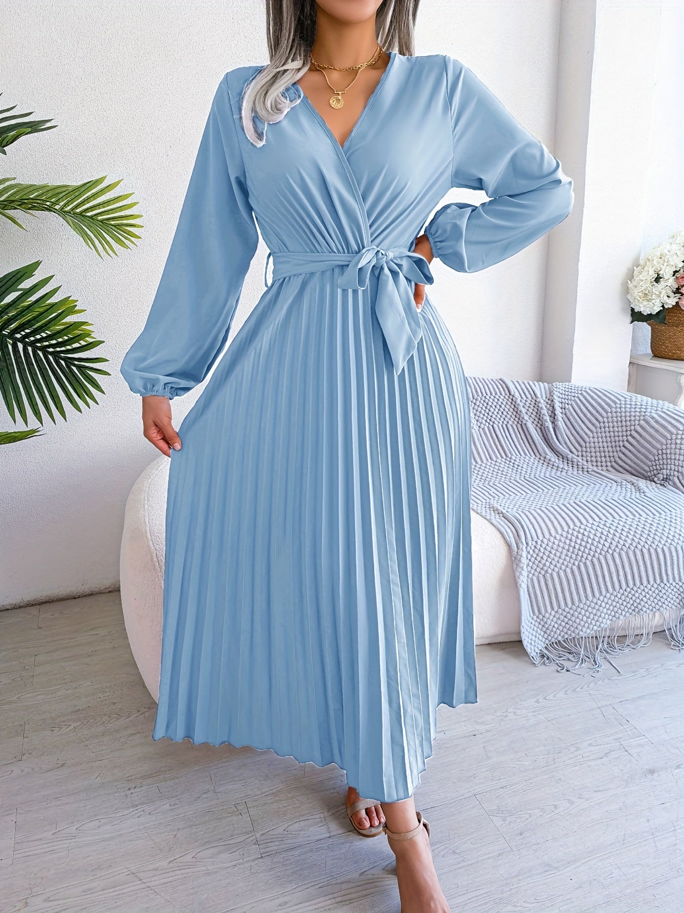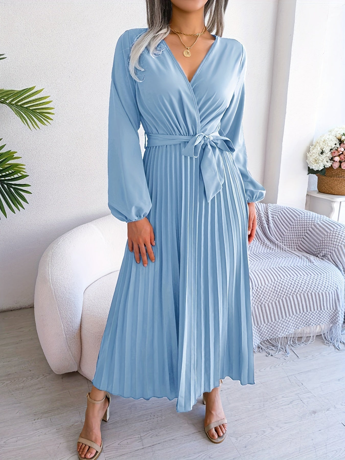 Pleated Surplice Neck Dress, Elegant Long Sleeve Solid Dress, Women's Clothing
