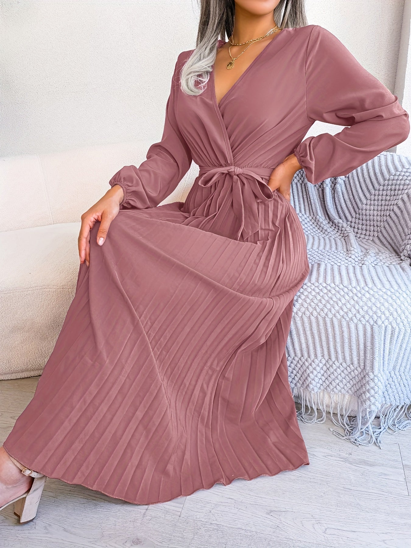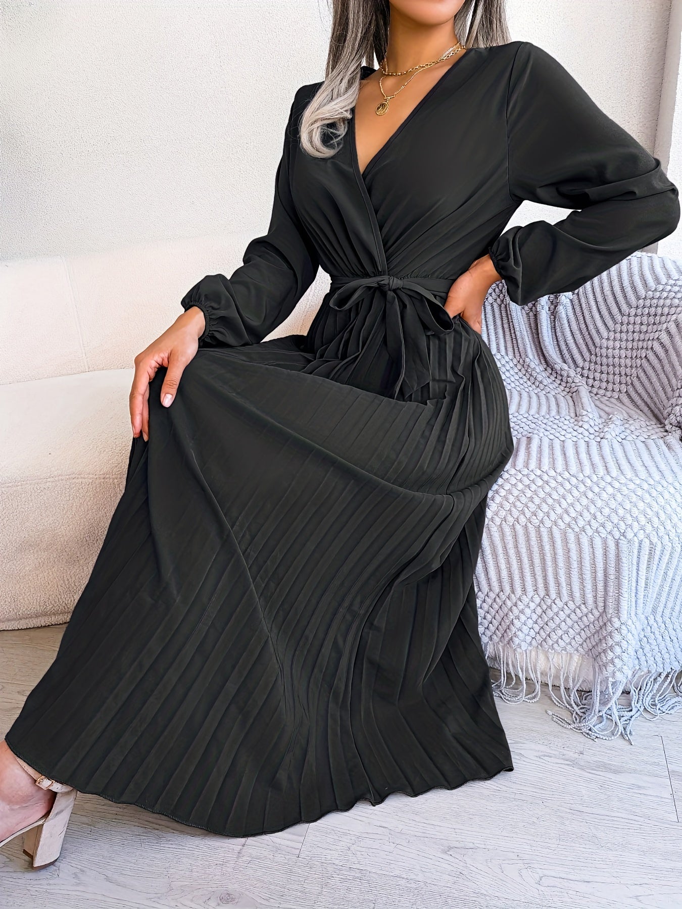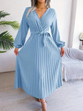 Sale Pleated Surplice Neck Dress, Elegant Long Sleeve Solid Dress, Women's Clothing