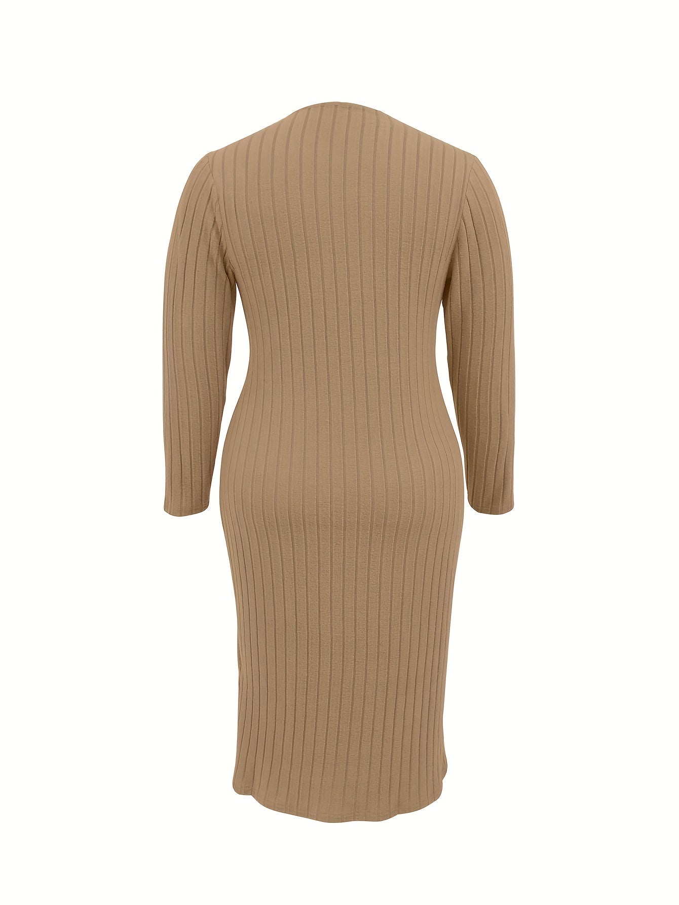 Basic Dress, Women's Solid Ribbed Long Sleeve Zipper V Neck Medium Stretch Bodycon Midi Dress