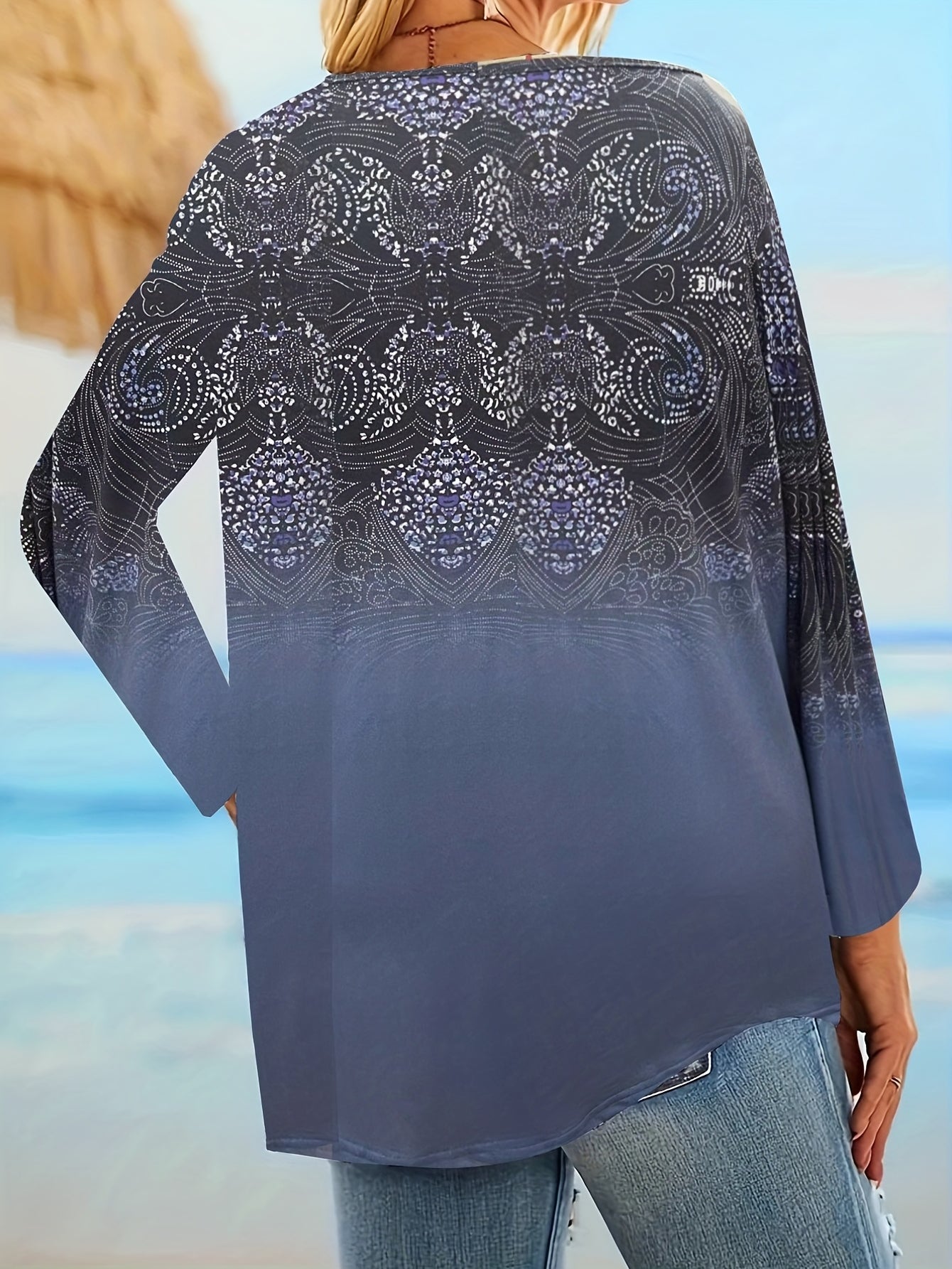 Casual Top, Women's Arabesque Print Long Sleeve Round Neck Henley Top
