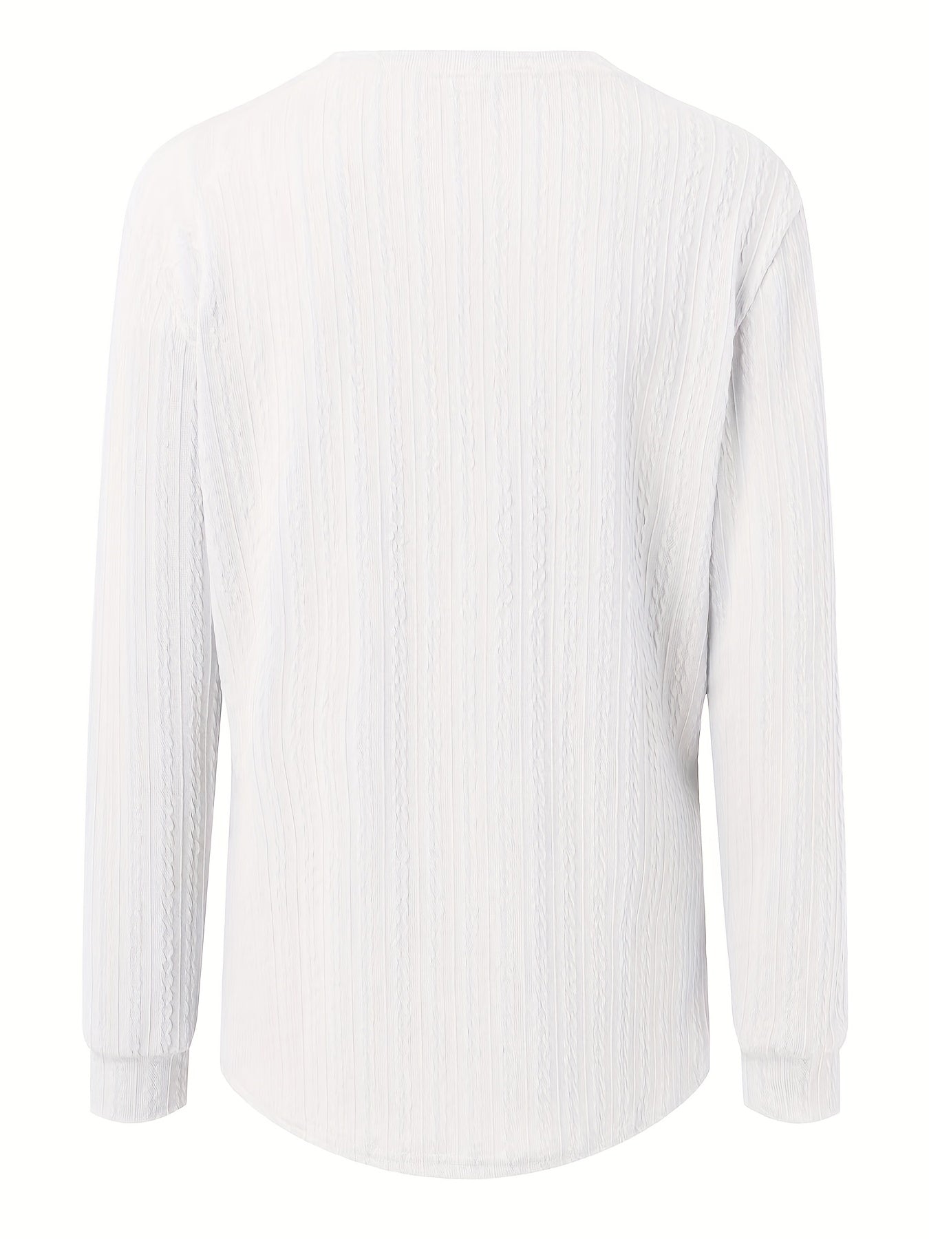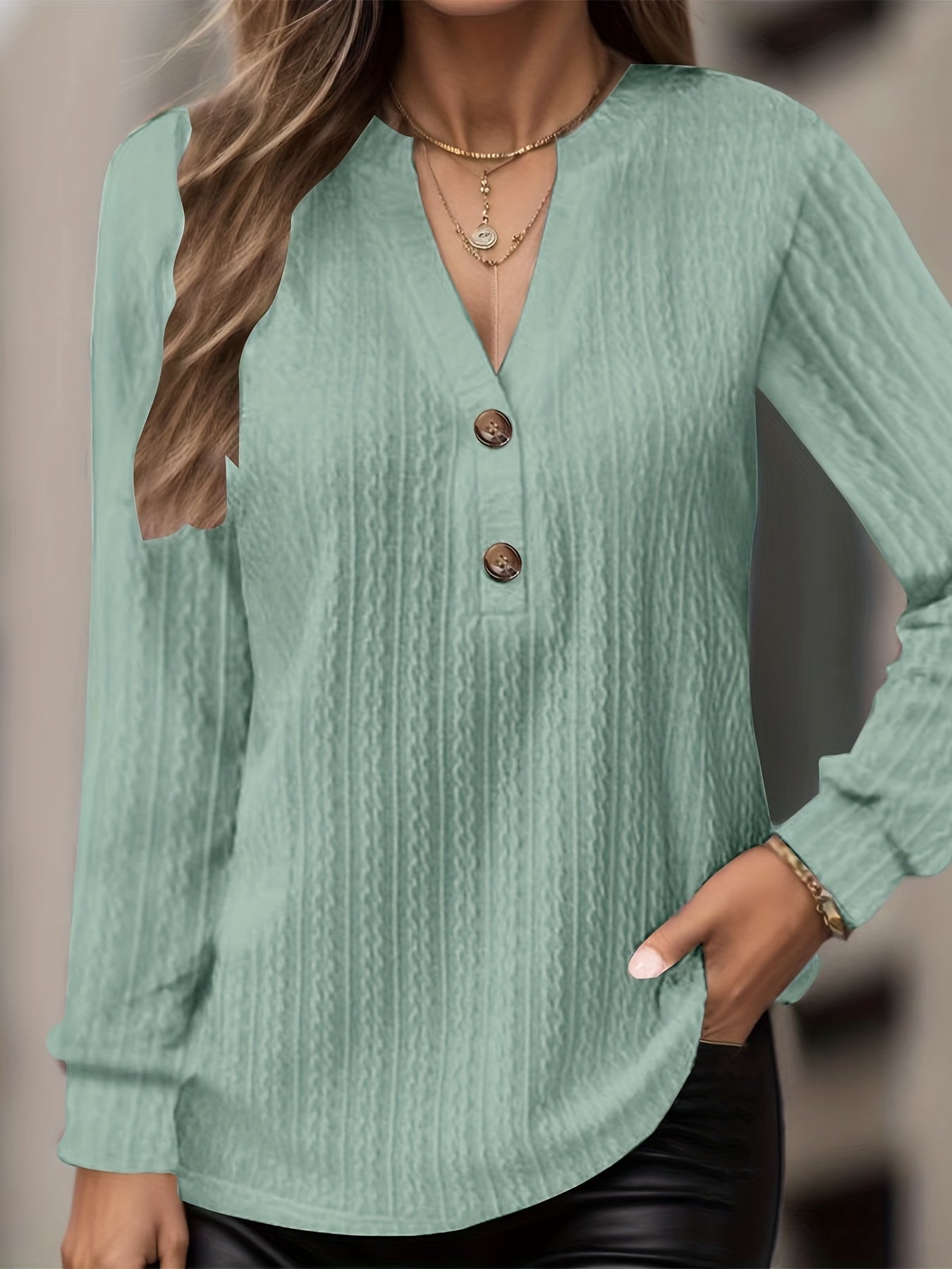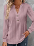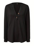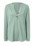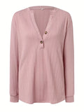 Plus Size Casual Top, Women's Plus Solid Cable Long Sleeve Button Decor V Neck Slight Stretch Top
