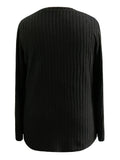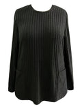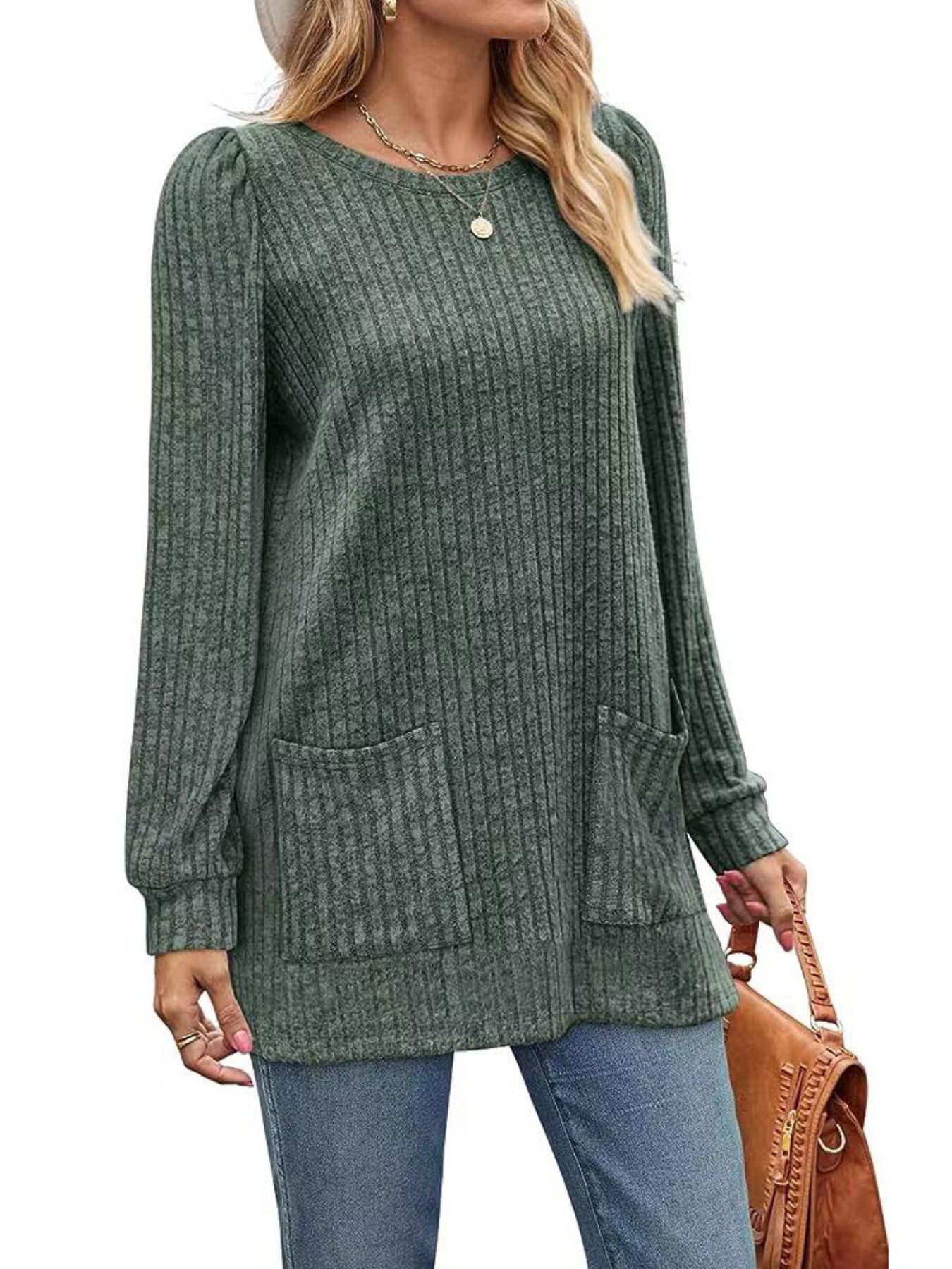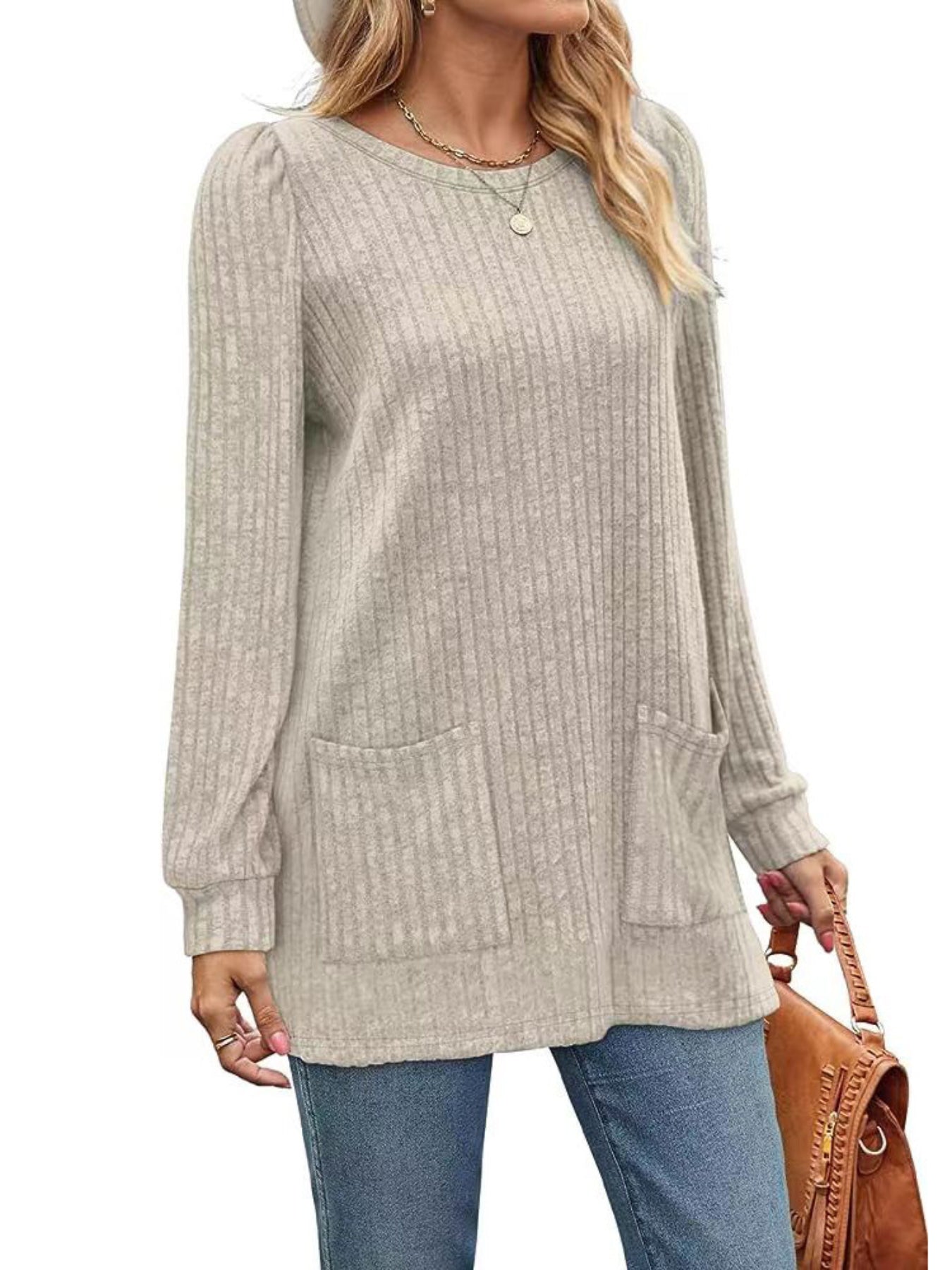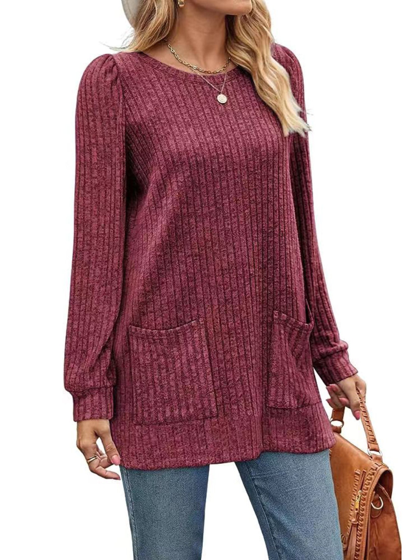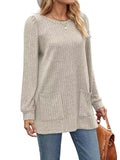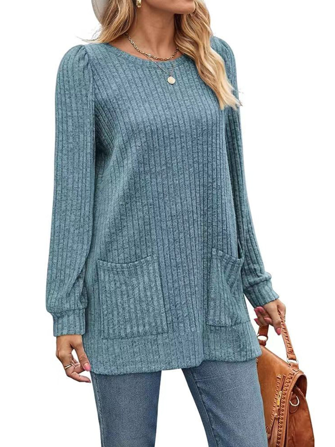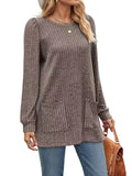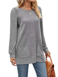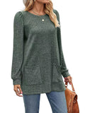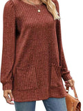 Sale Casual Top, Women's Solid Ribbed Long Sleeve Round Neck Medium Stretch Top With Pockets