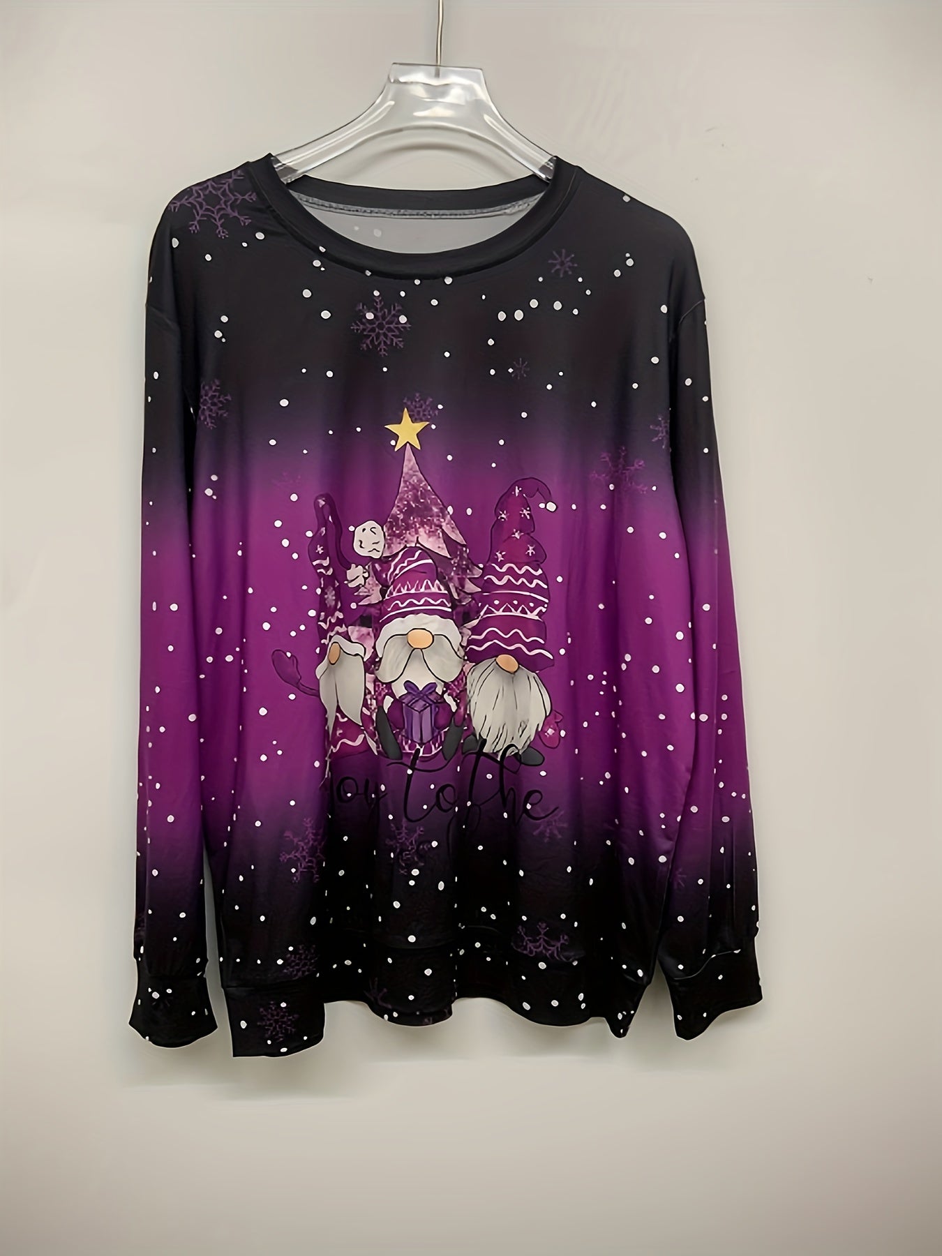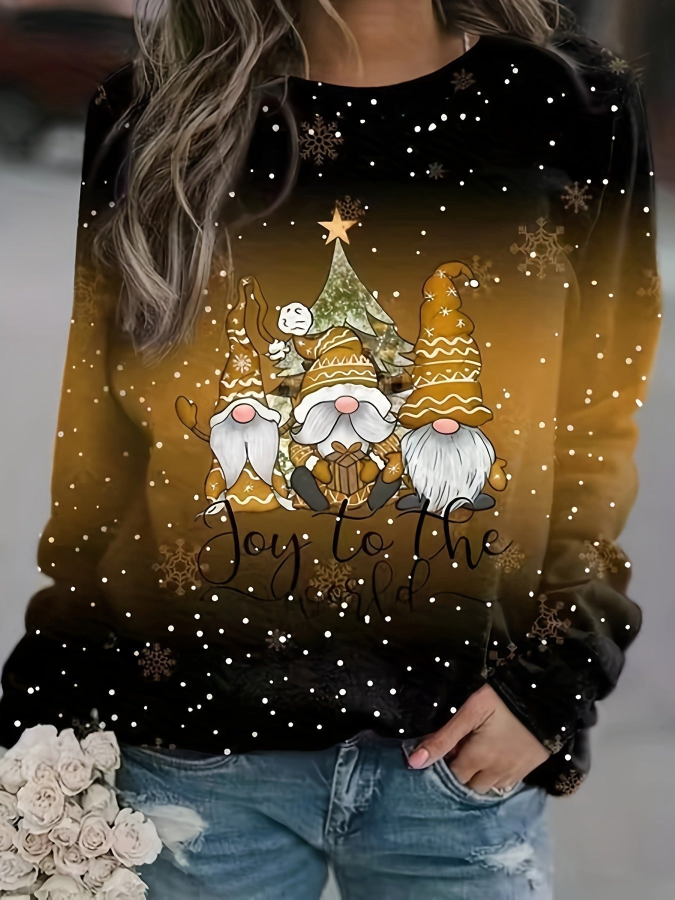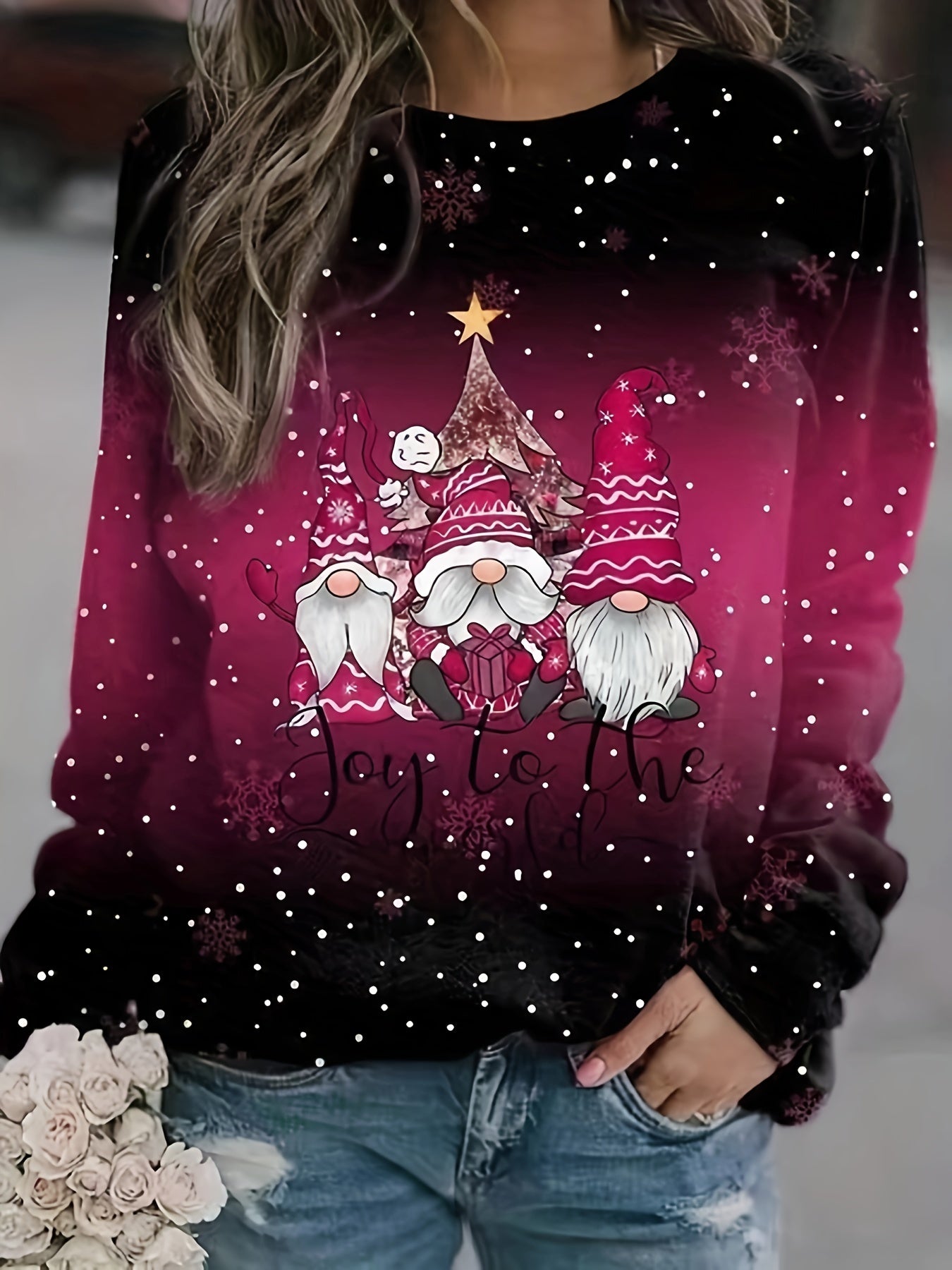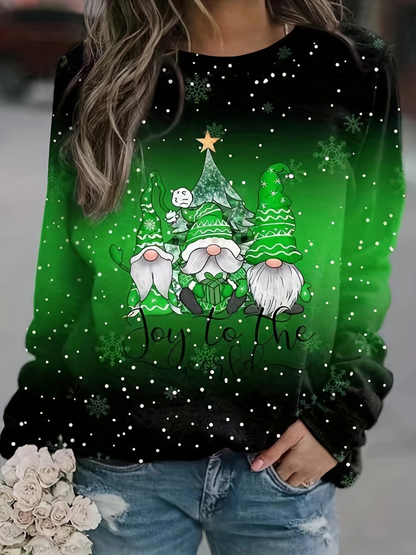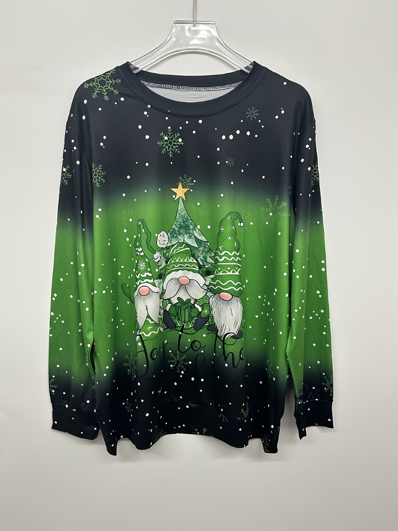 Christmas Top, Women's Christmas Dwarf & Slogan Print Ombre Long Sleeve Round Neck Slight Stretch Top