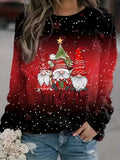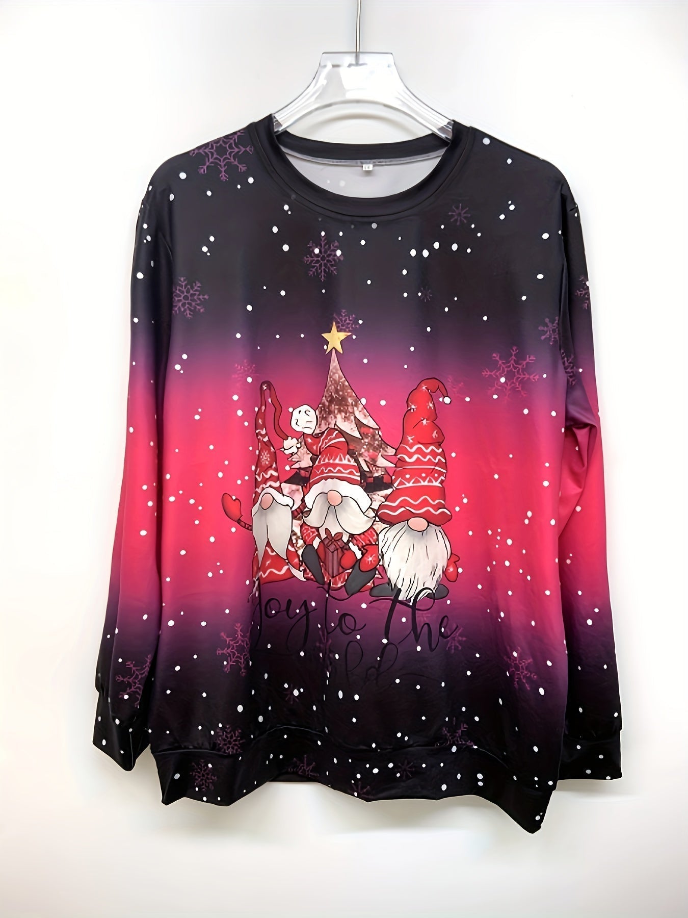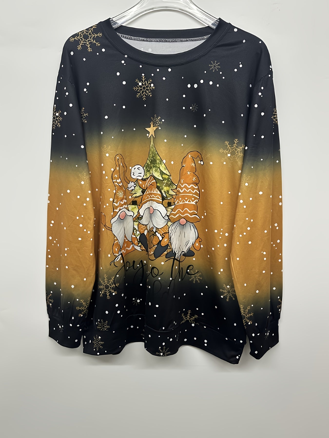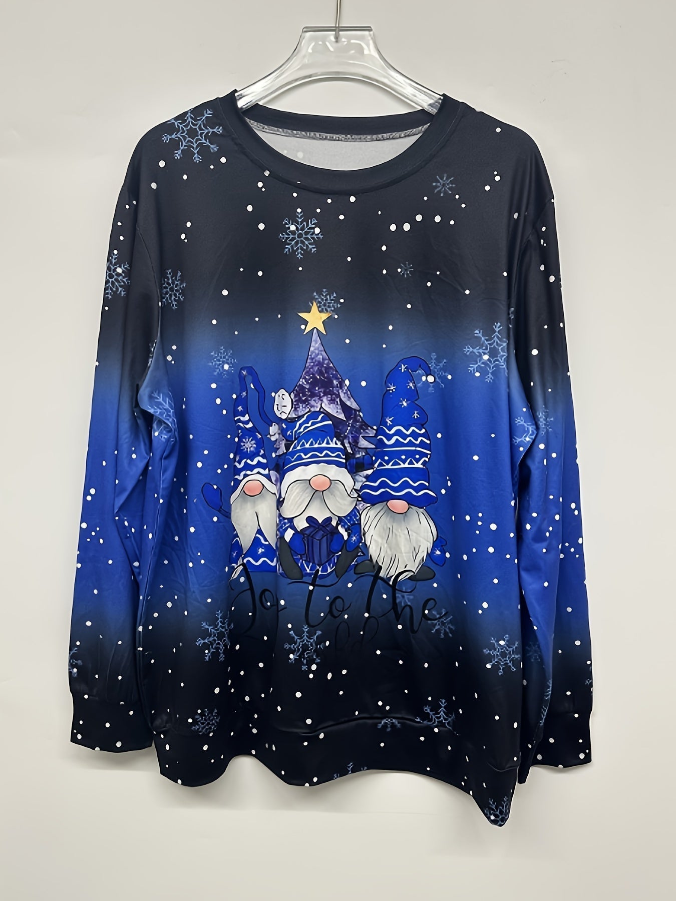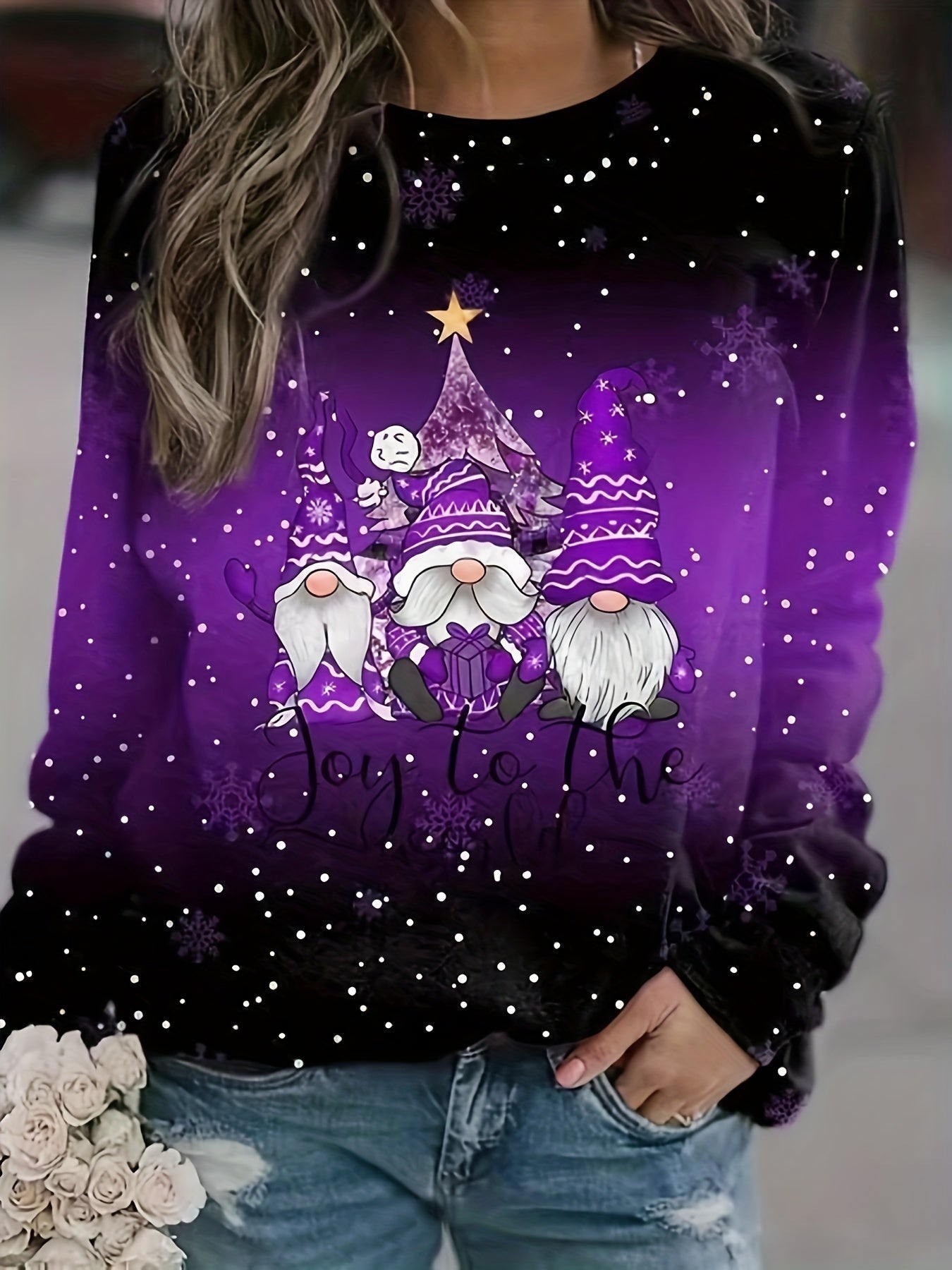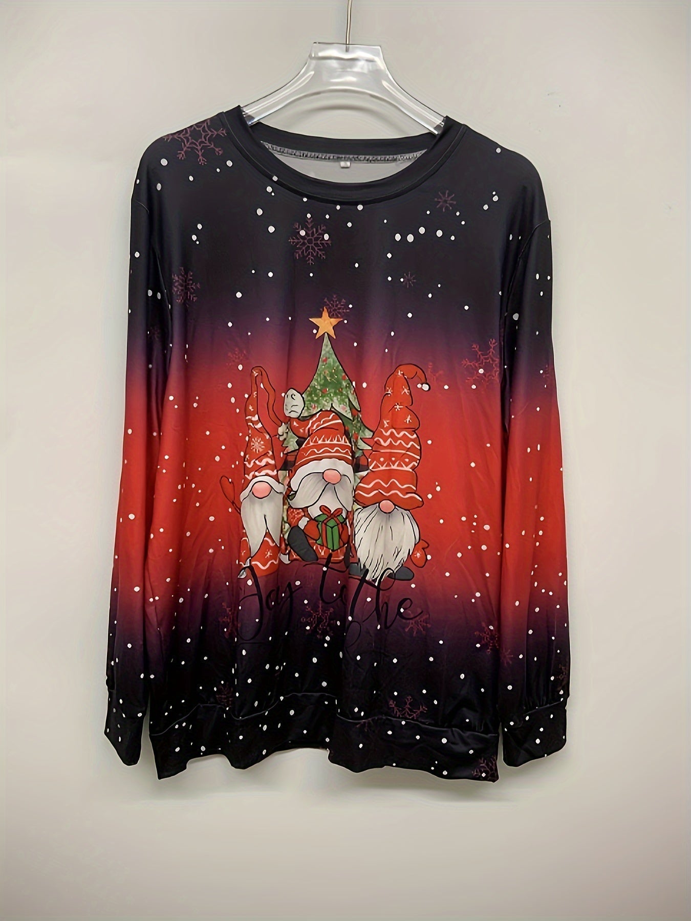 Christmas Top, Women's Christmas Dwarf & Slogan Print Ombre Long Sleeve Round Neck Slight Stretch Top