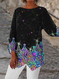 Christmas Top, Women's Glitter Christmas Tree Print Three Quarter Sleeve V Neck Slight Stretch Top