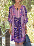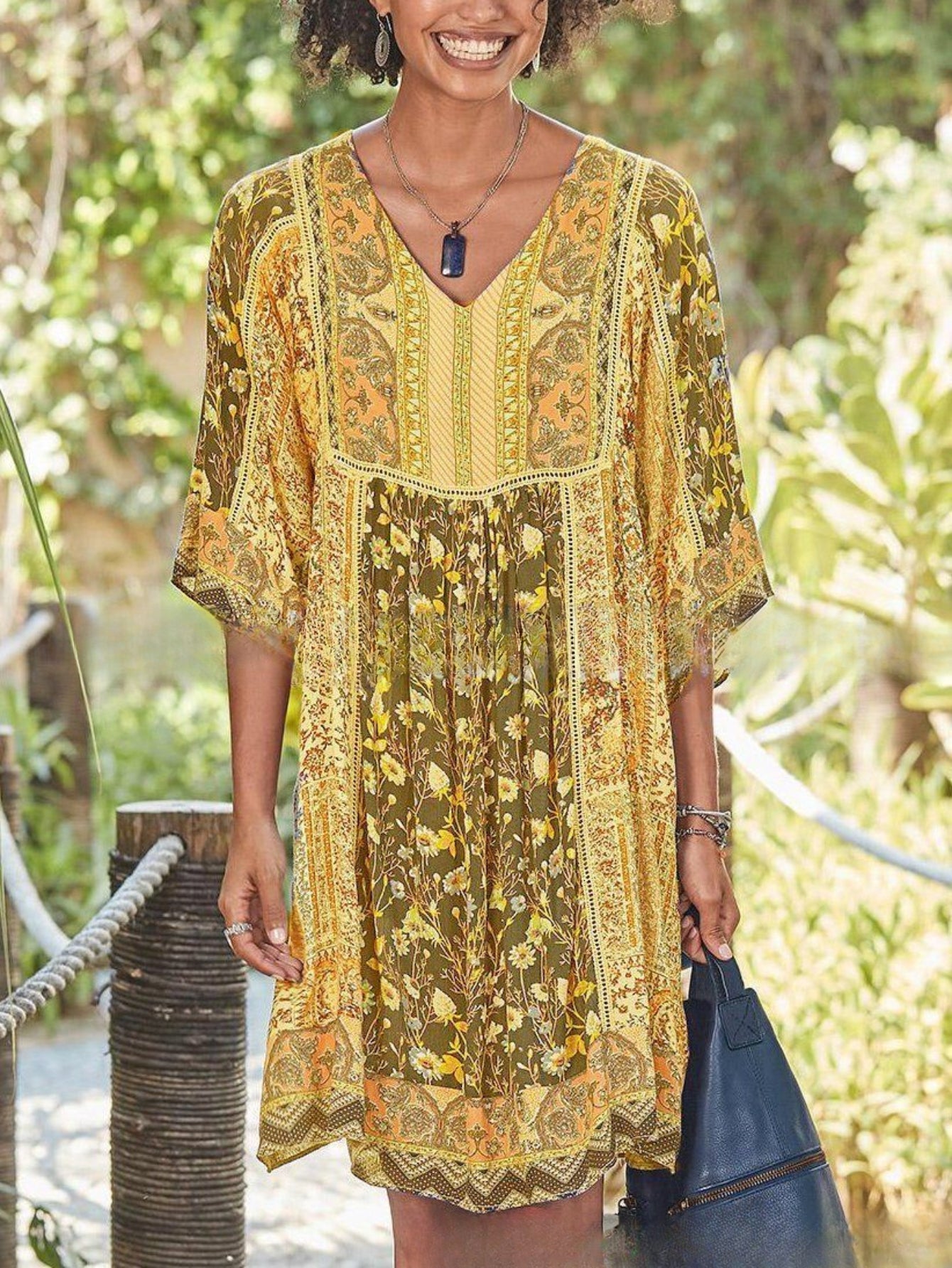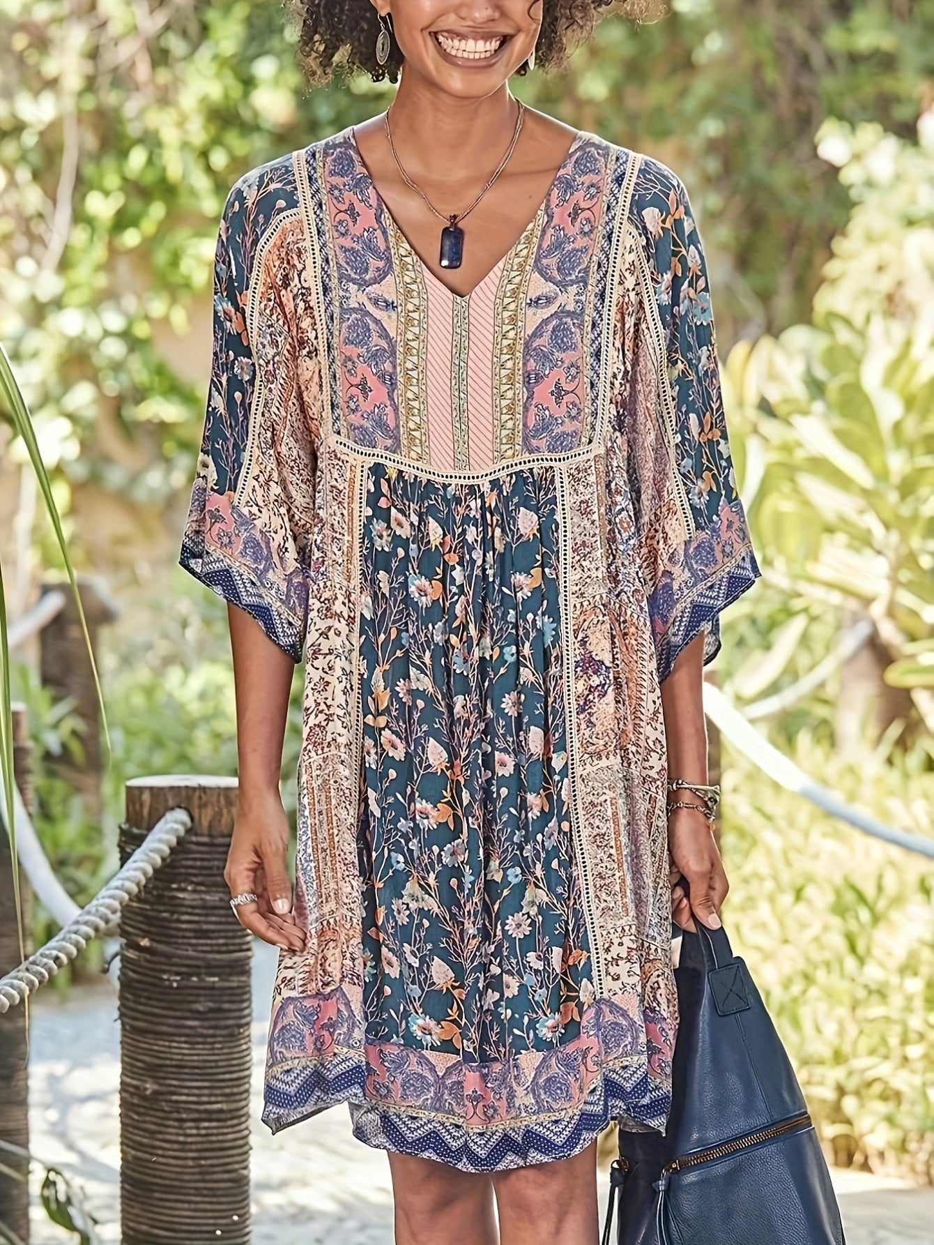 Plus Size Floral Print V Neck Loose Dress, Casual 3/4 Sleeve Dress