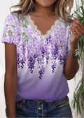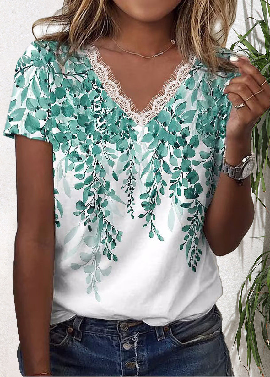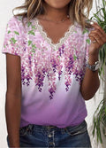 Printed V-neck Lace Hem Short Sleeve T-shirt