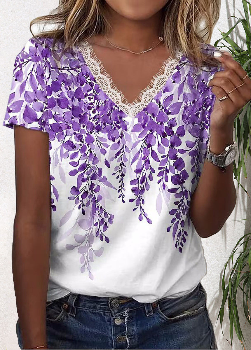 Sale Printed V-neck Lace Hem Short Sleeve T-shirt