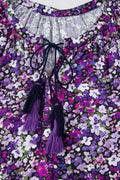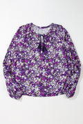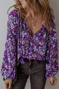 Sale Purple Boho Flower Split V Neck Bubble Sleeve Blouse