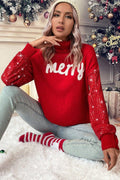 Sale Racing Red Merry Graphic Sequin Sleeves Christmas Turtleneck Sweater