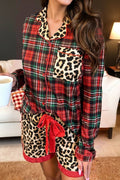 Racing Red Retro Plaid Leopard Print Patchwork Long Sleeve Shorts Pajama Set