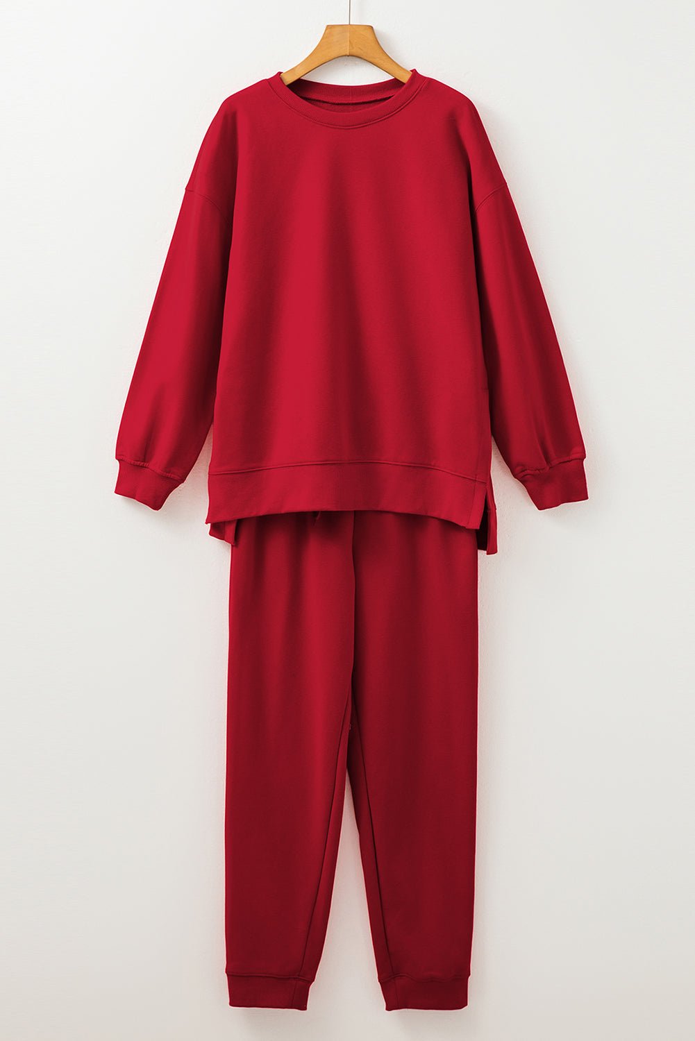 - Elevate your style with this chic high low pullover and pant set.Crafted from premium quality fabric for comfort and durability.Crew neck sweatshirt with a loose fit style, drop shoulder and side slit finished.The slim fit pants enhance a slender silhouette.