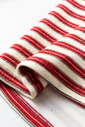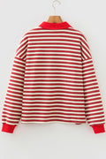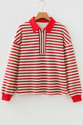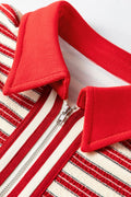 Racing Red Striped Print Contrast Collar Zip V Neck Long Sleeve Top