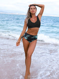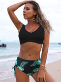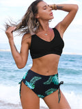 Sale Tropical Leaf Print V Neck High Waist Bikini Sets, Drawstring Spaghetti Straps Boxer Short Bottoms Two Pieces Swimsuit