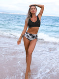 Sale Black & White Paisley Floral Print Knot 2 Piece Set Bikini, Ring Hollow Out Stretchy Cross Top & Skorts Swimsuits