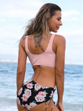 Sale Tropical Print Round Neck Tankini Sets, Drawstring Straps Boxer Short Bottom Two Pieces Swimsuit