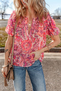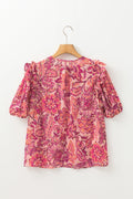 Sale Red Floral Print Ruffled Puff Short Sleeve Blouse