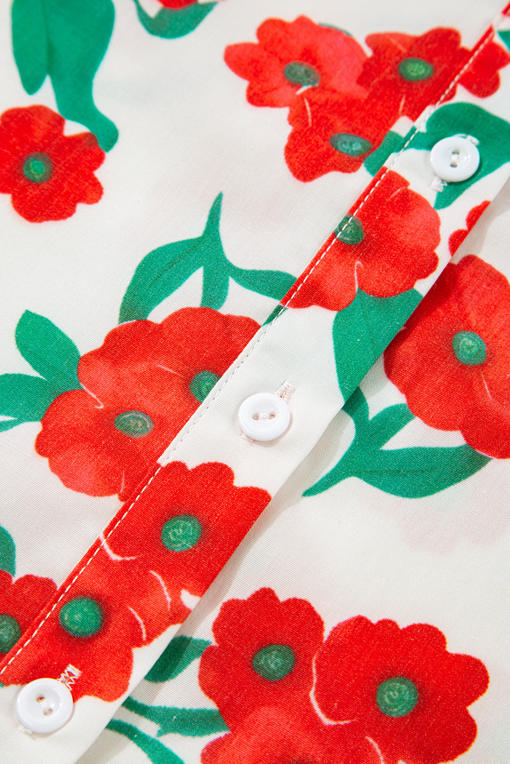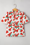 Red Floral Print Ruffled Puff Sleeve Elegant Summer Shirt