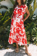 Sale Red Floral Print Trimmed V Neck Ruffle Sleeve Long Dress