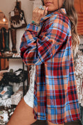 Sale Brown Plaid Patchwork Long Sleeve Button Hooded Blouse