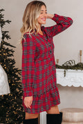 Red Plaid Shirt Collar Half Button Ruffle Hem Long Sleeve Mini Dress