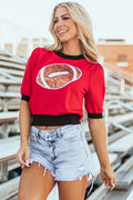 Red Sequin Rugby Color Block Puff Short Sleeve Sweater