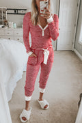 Red Stripe Buttoned V Neck Top and Knotted Waist Pants Lounge Set