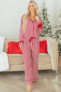 - Christmas pajamas for women in a popular striped pattern.The silky 2-piece set includes a shirt-style long-sleeve top and pants.Contrast trimming details and ribbon knot at cuffs and waistband.The womens pajama pant set is suitable for Christmas and everyday wear.