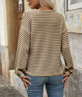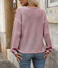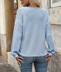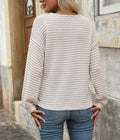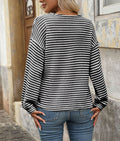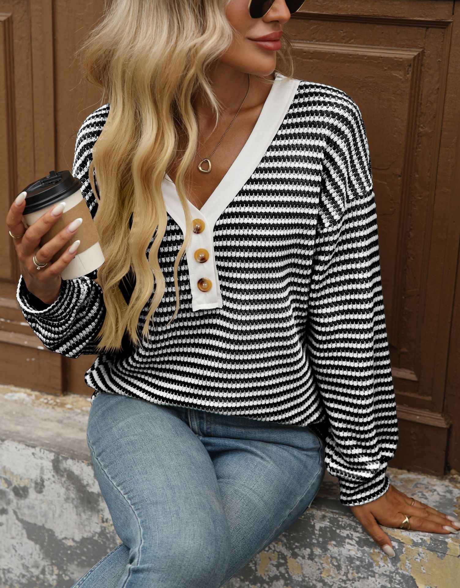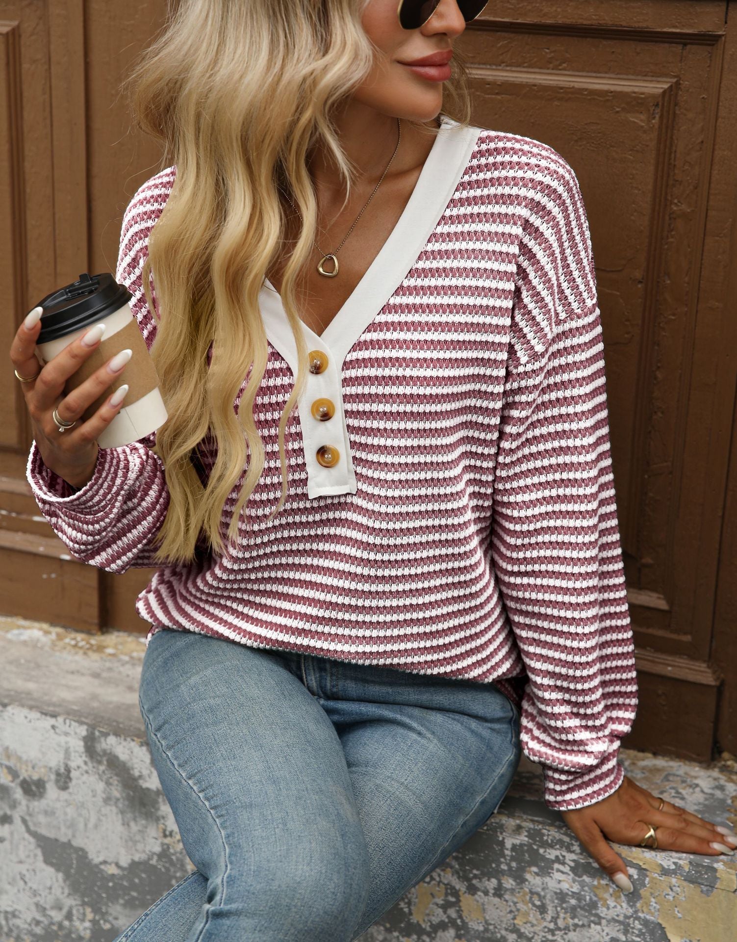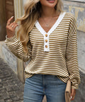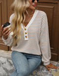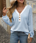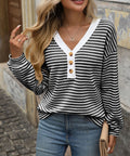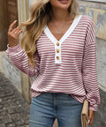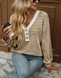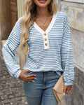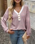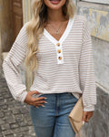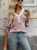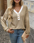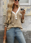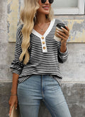 Sale Striped Botton Crew Neck T-Shirt, Elegant Long Sleeve T-Shirt