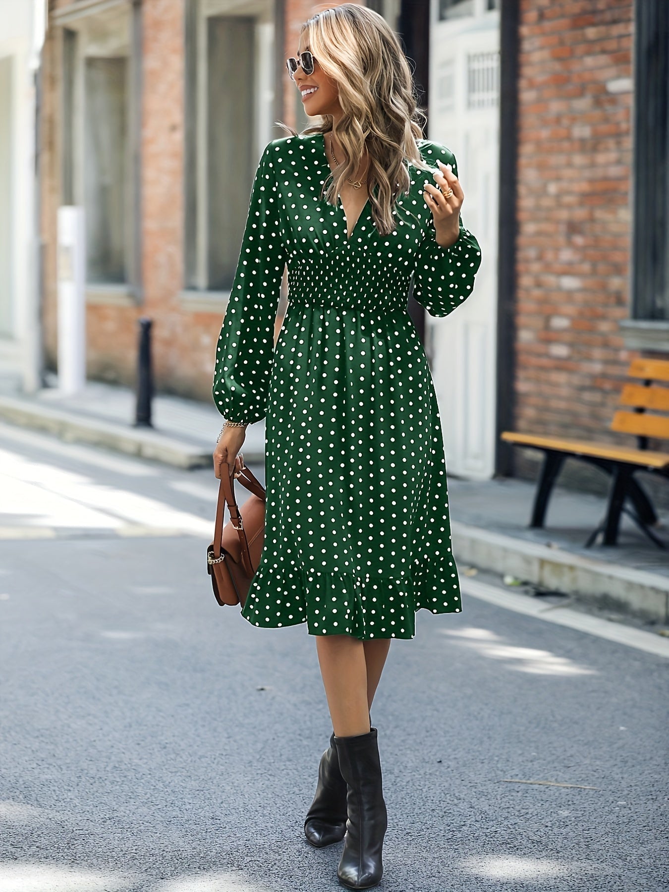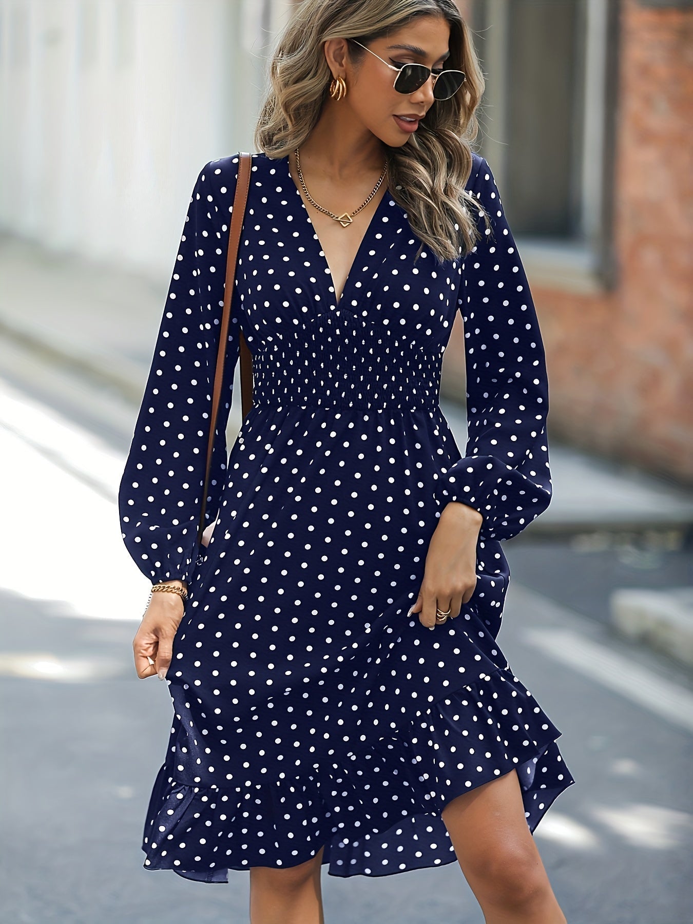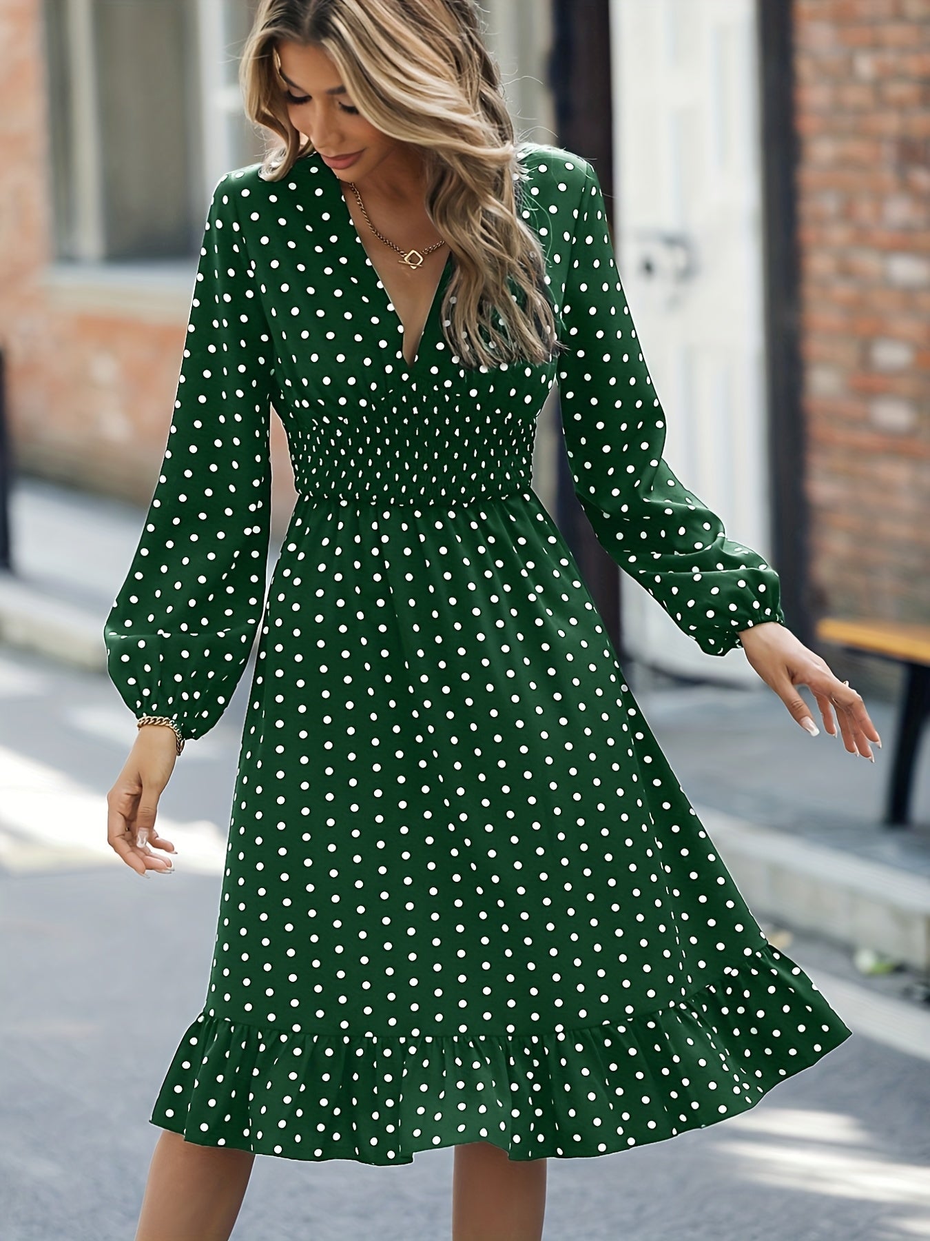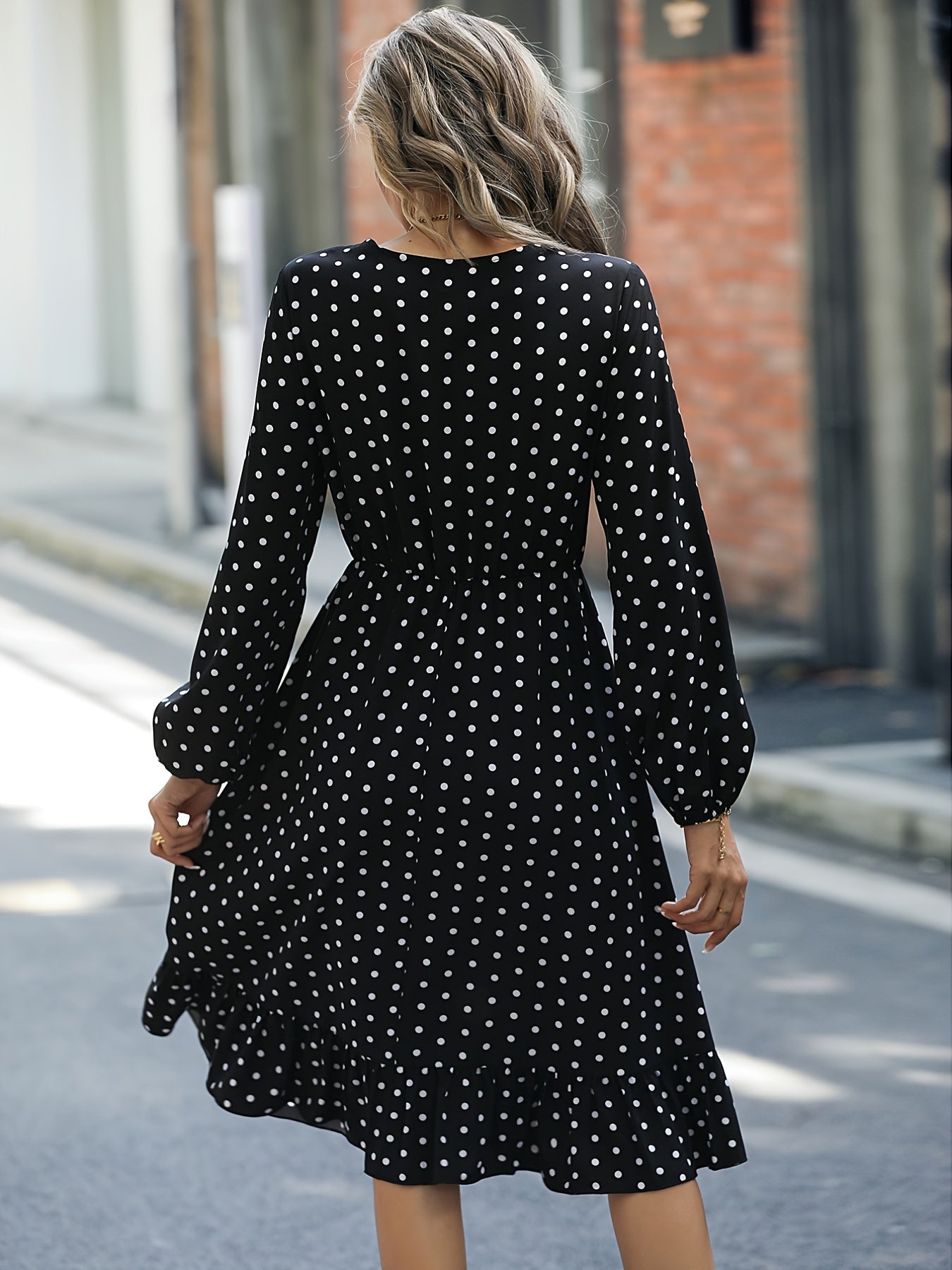 Retro V-neck Ruffle Dress, Polka Dot Print Long Sleeve Waist Loose Summer Dresses